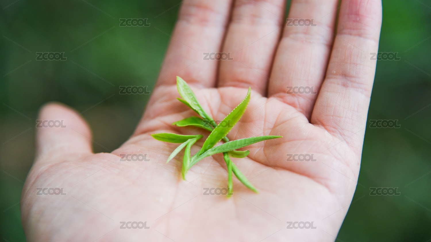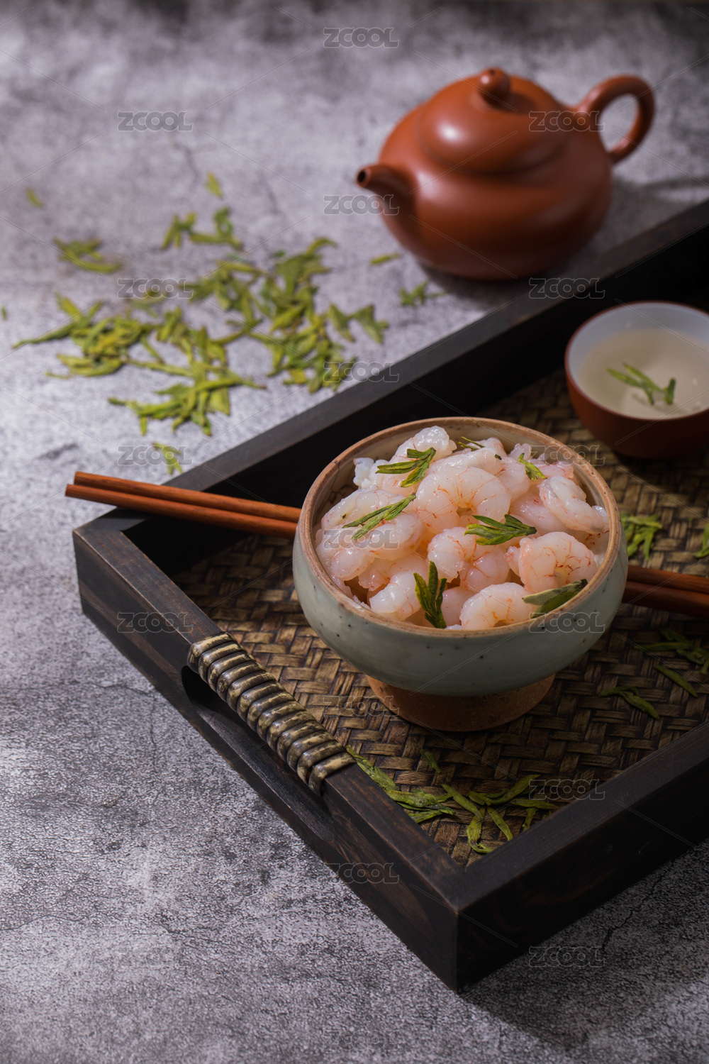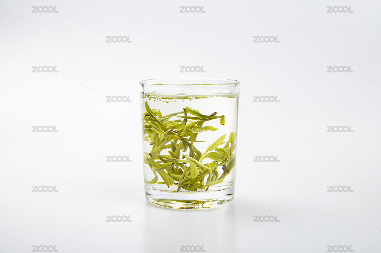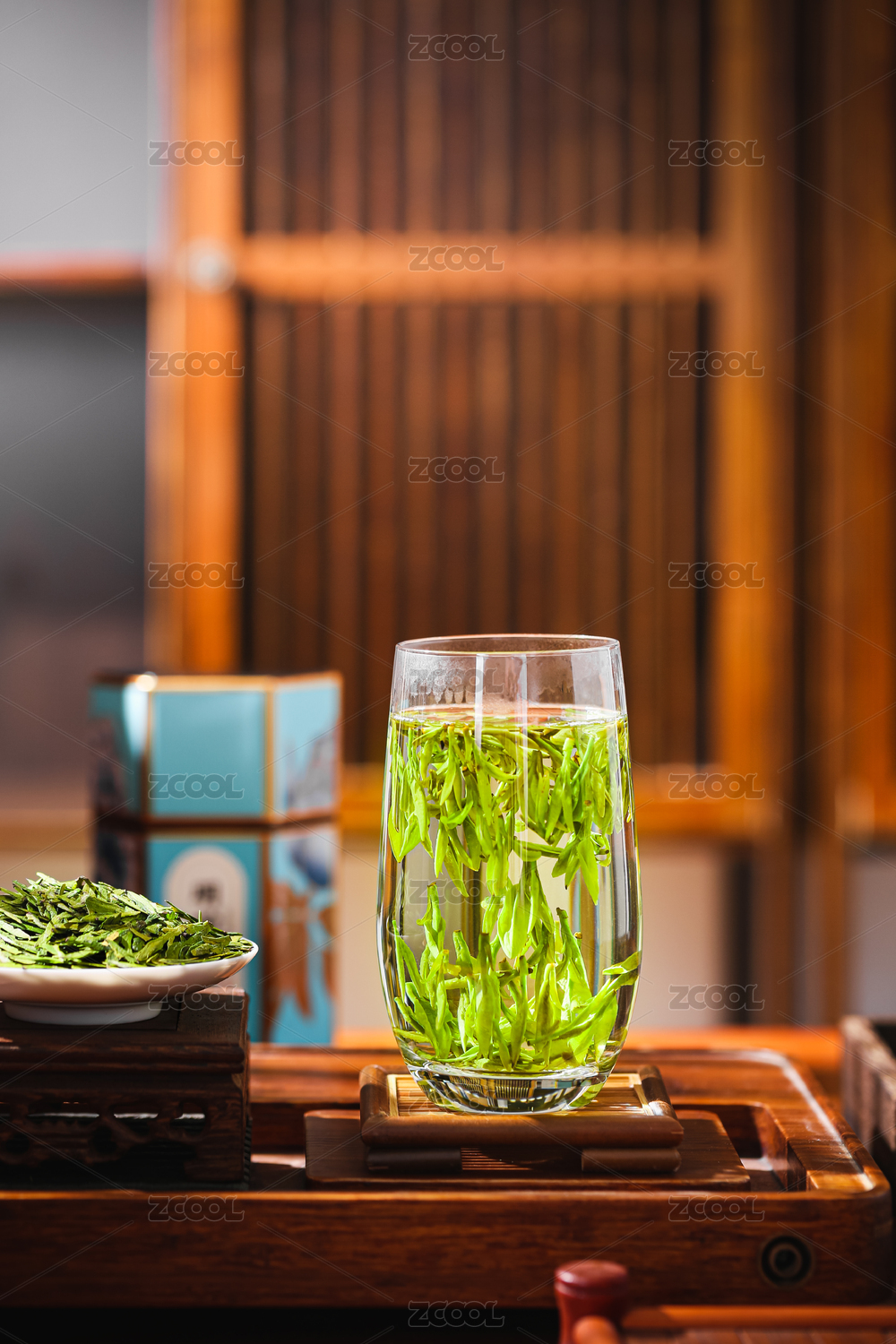 瓷小盘上面放着嫩绿色西湖龙井叶底