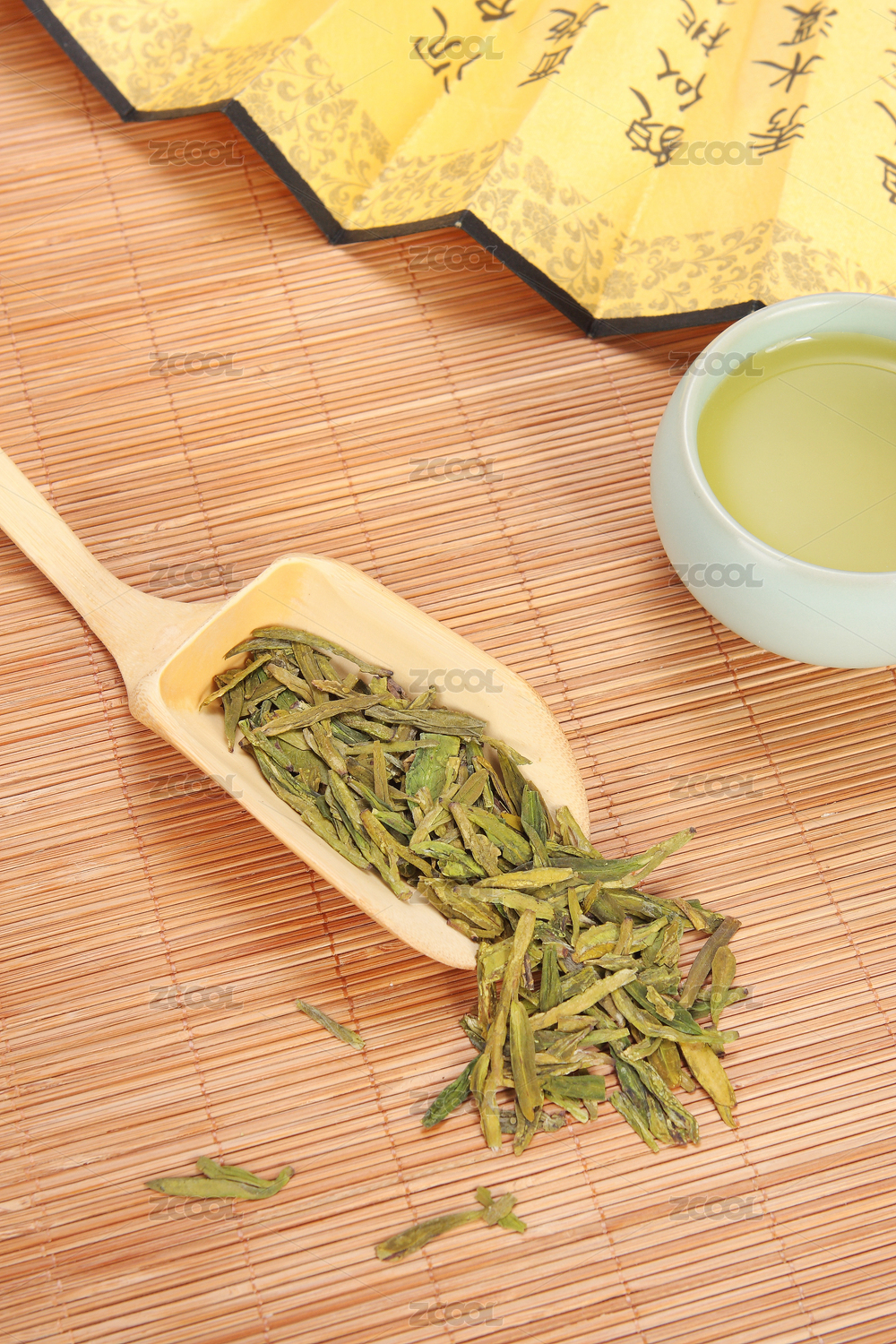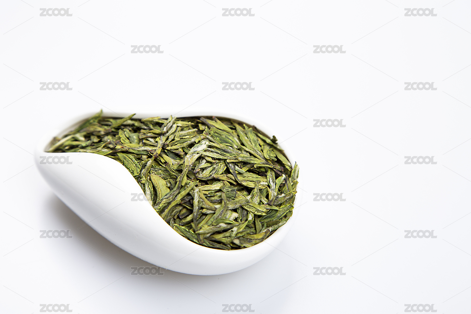 白瓷茶荷里装满了嫩绿色的狮峰西湖龙井