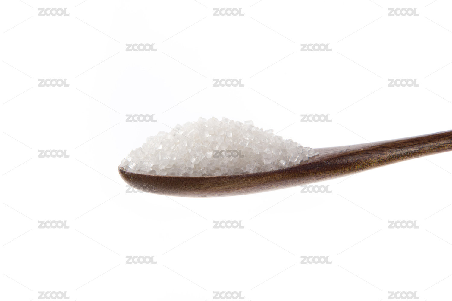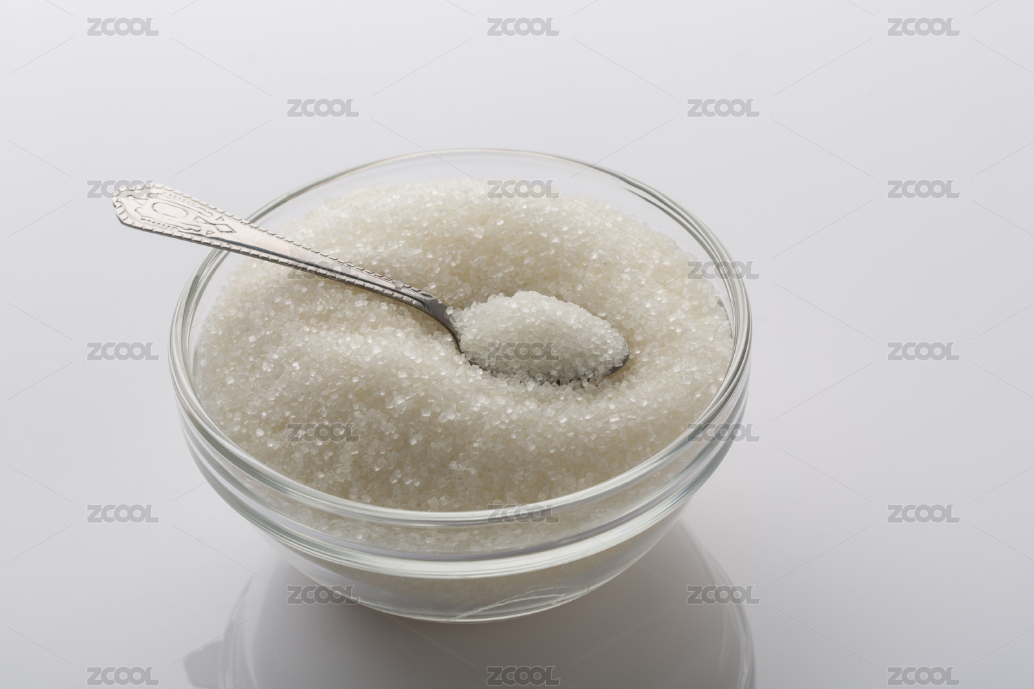 玻璃碗中的白糖和银色的勺子在白色背景上