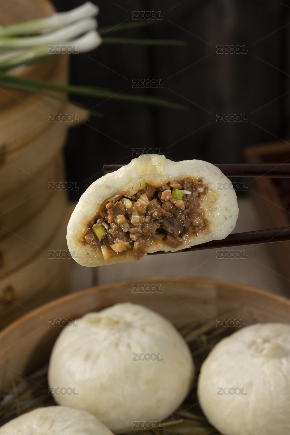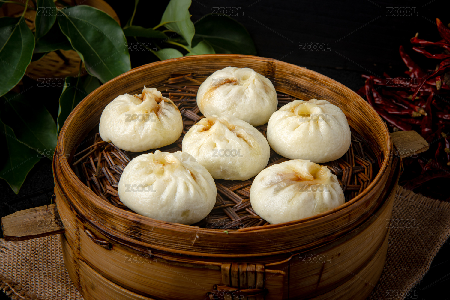 竹蒸笼上的中式点心小吃包子酱肉包子