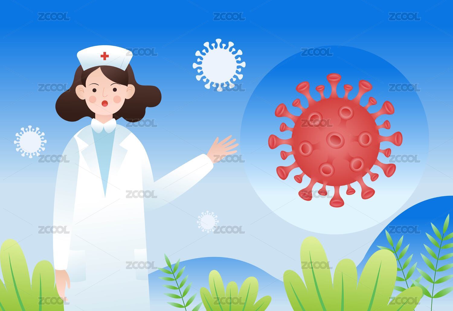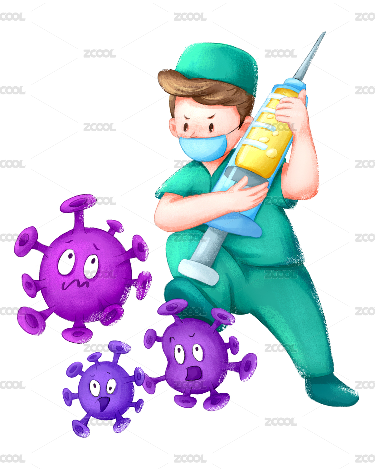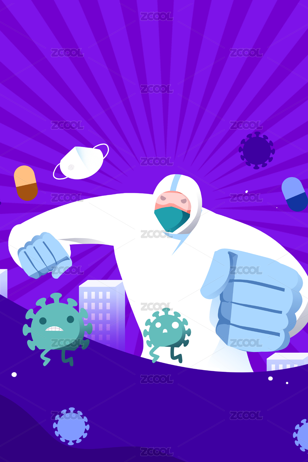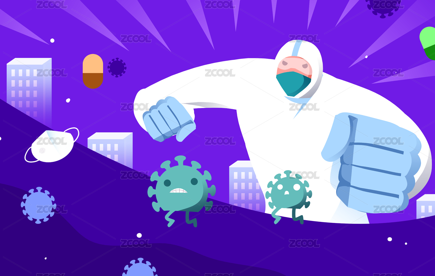 穿防护服医护人员和病菌作斗争插画