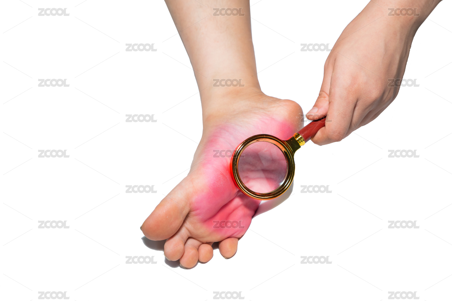 专家用放大镜诊断脚部臭味瘙痒细菌病菌感染疾病灰指甲脚气香港脚棚拍白色背景