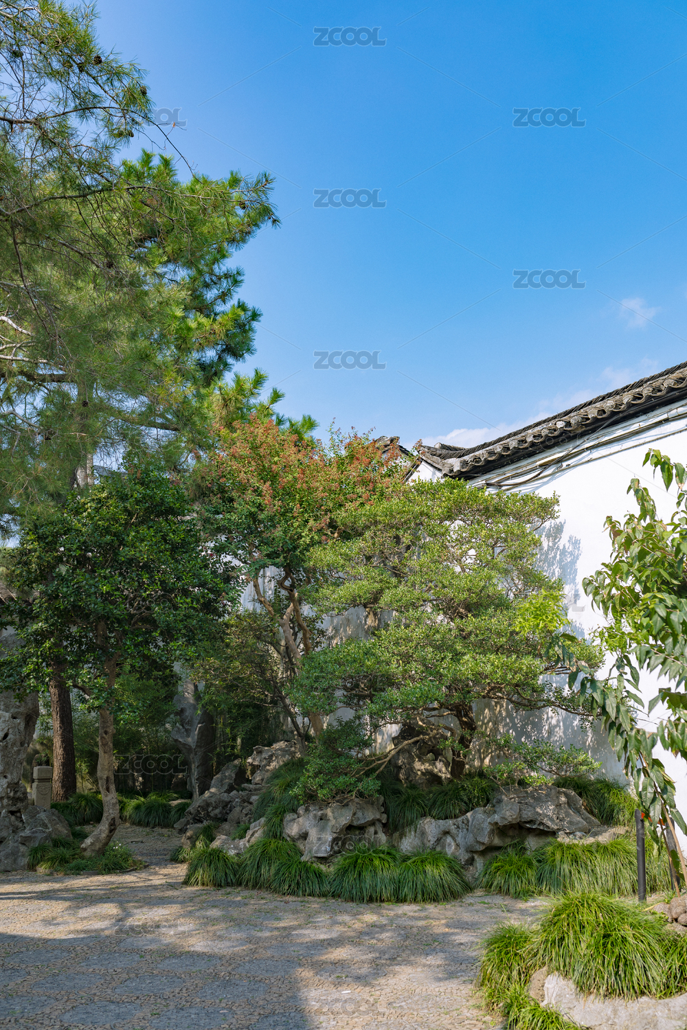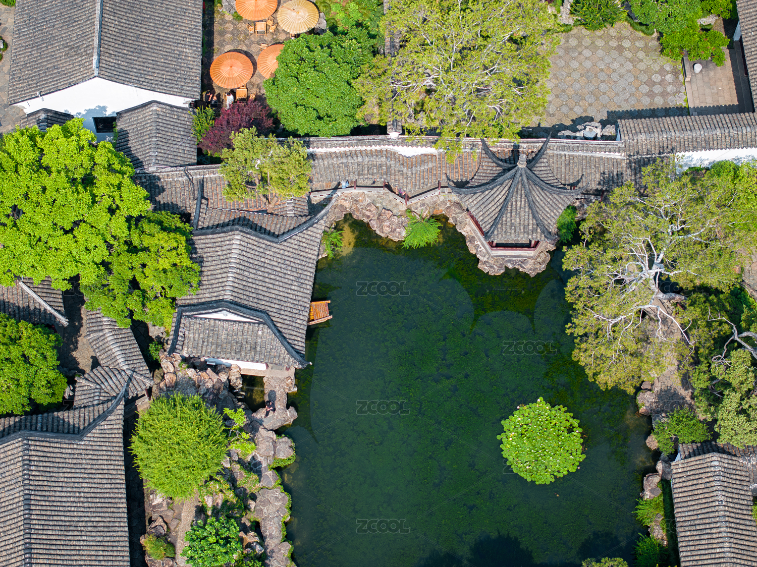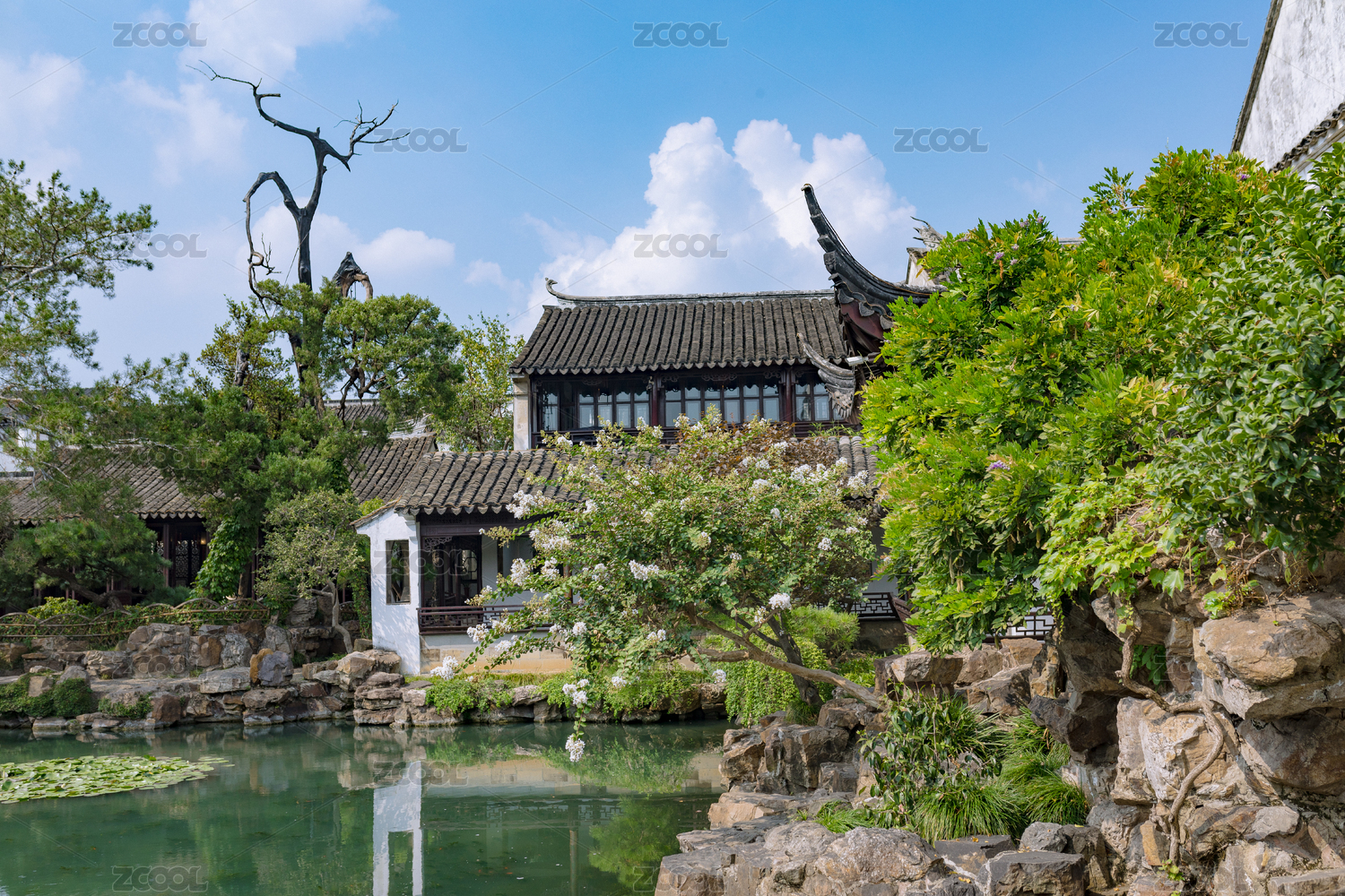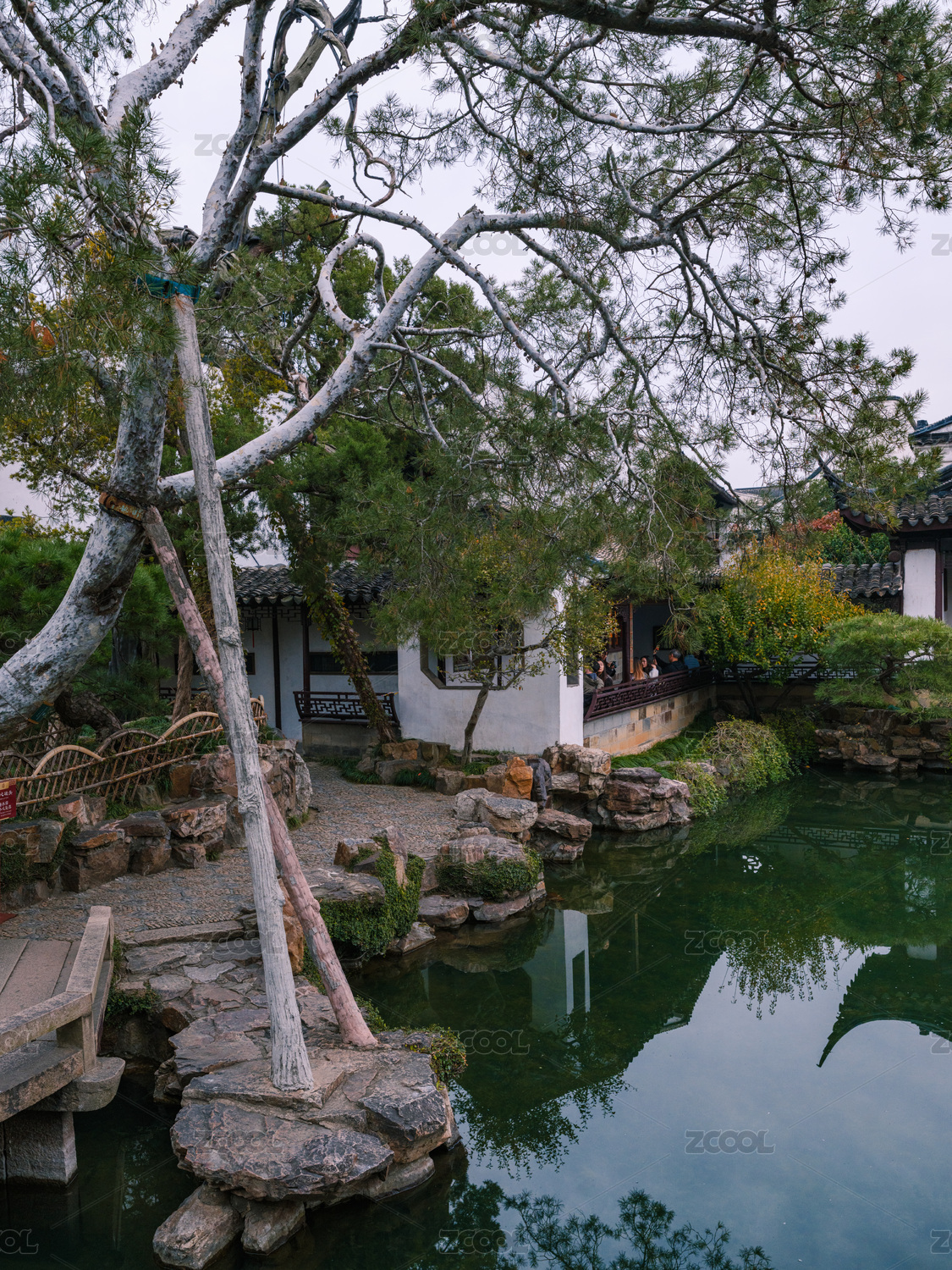 深秋时节苏州网师园亭台楼阁和池塘倒影