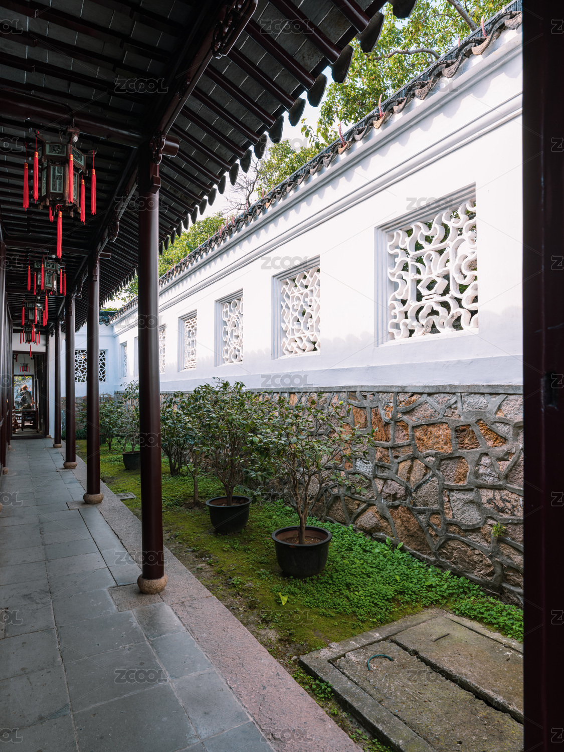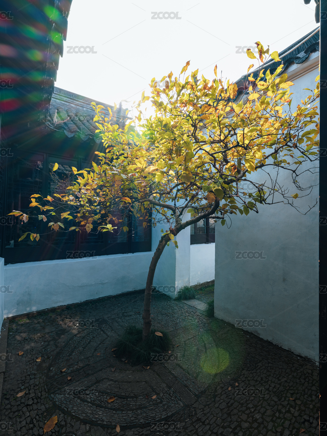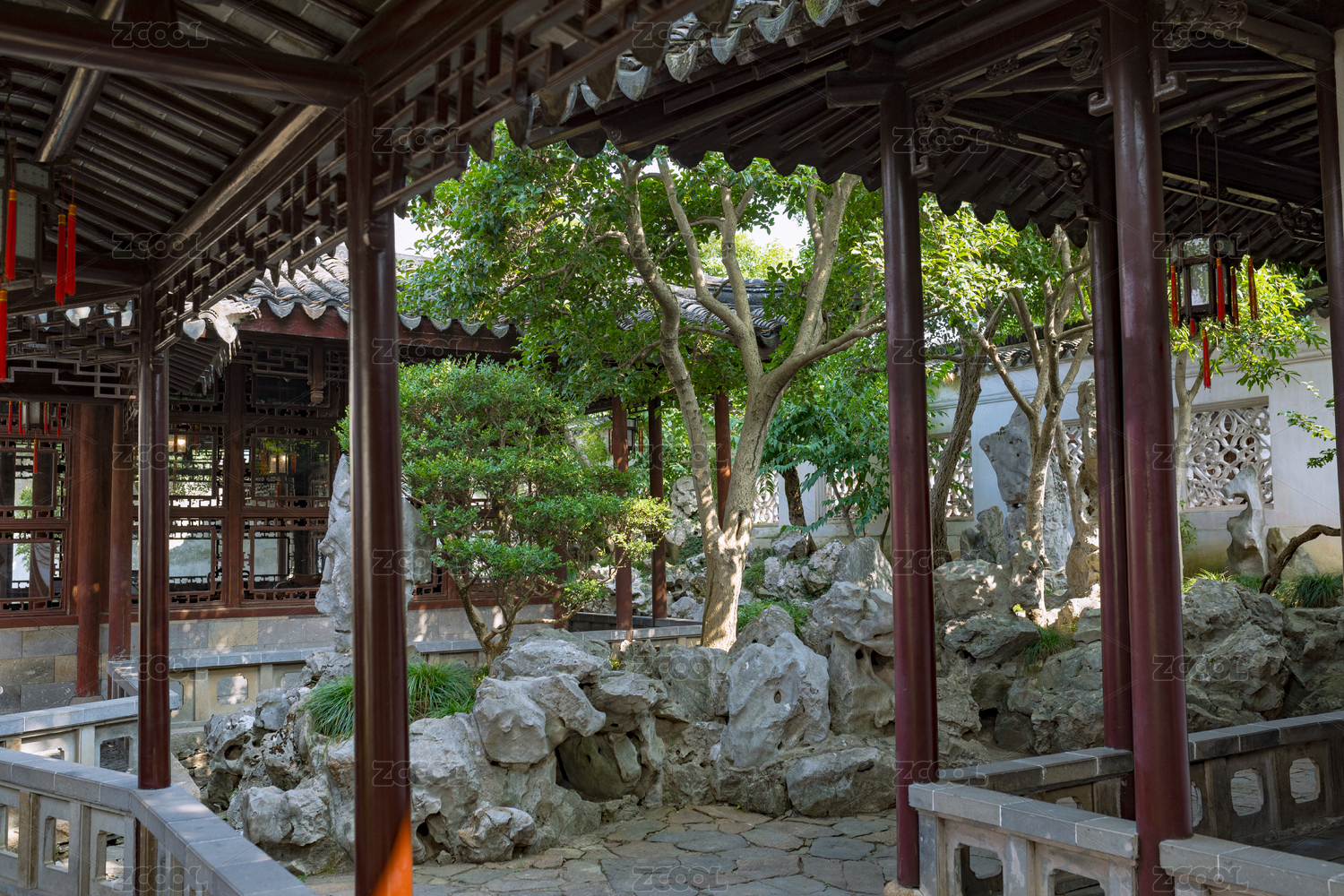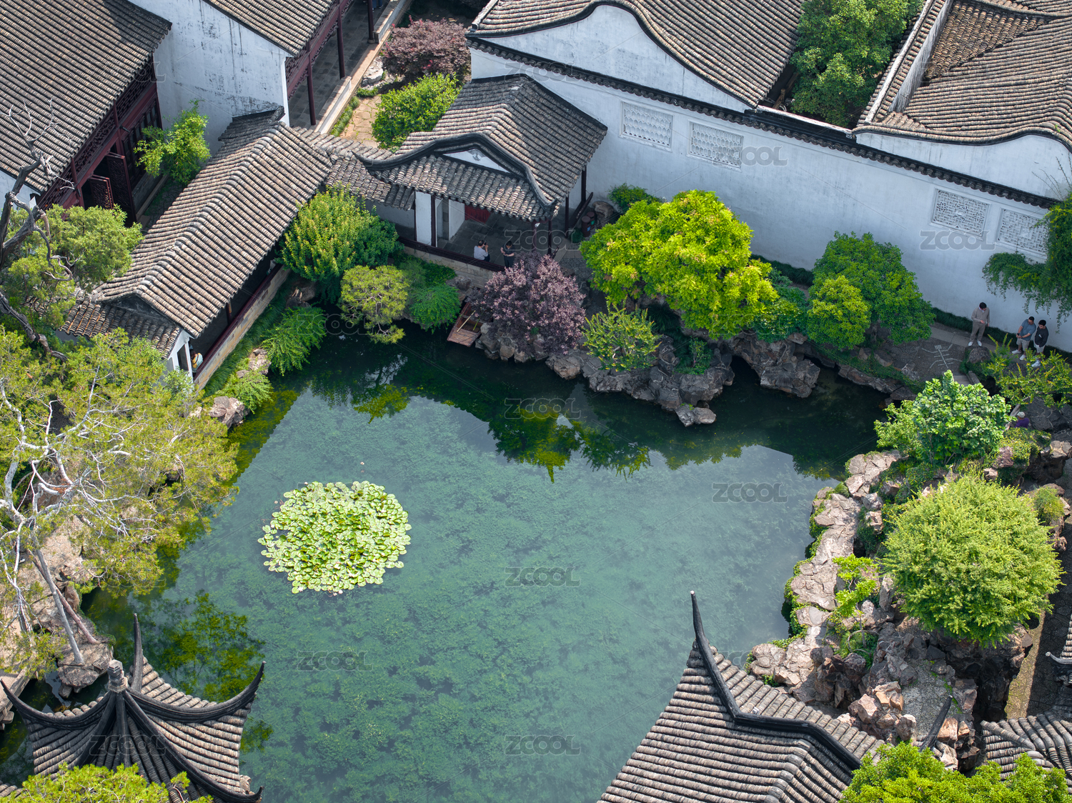 深秋时节苏州网师园亭台楼阁和池塘倒影