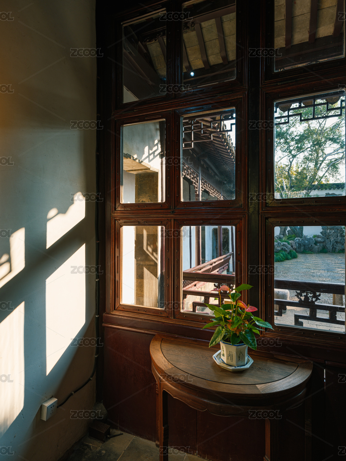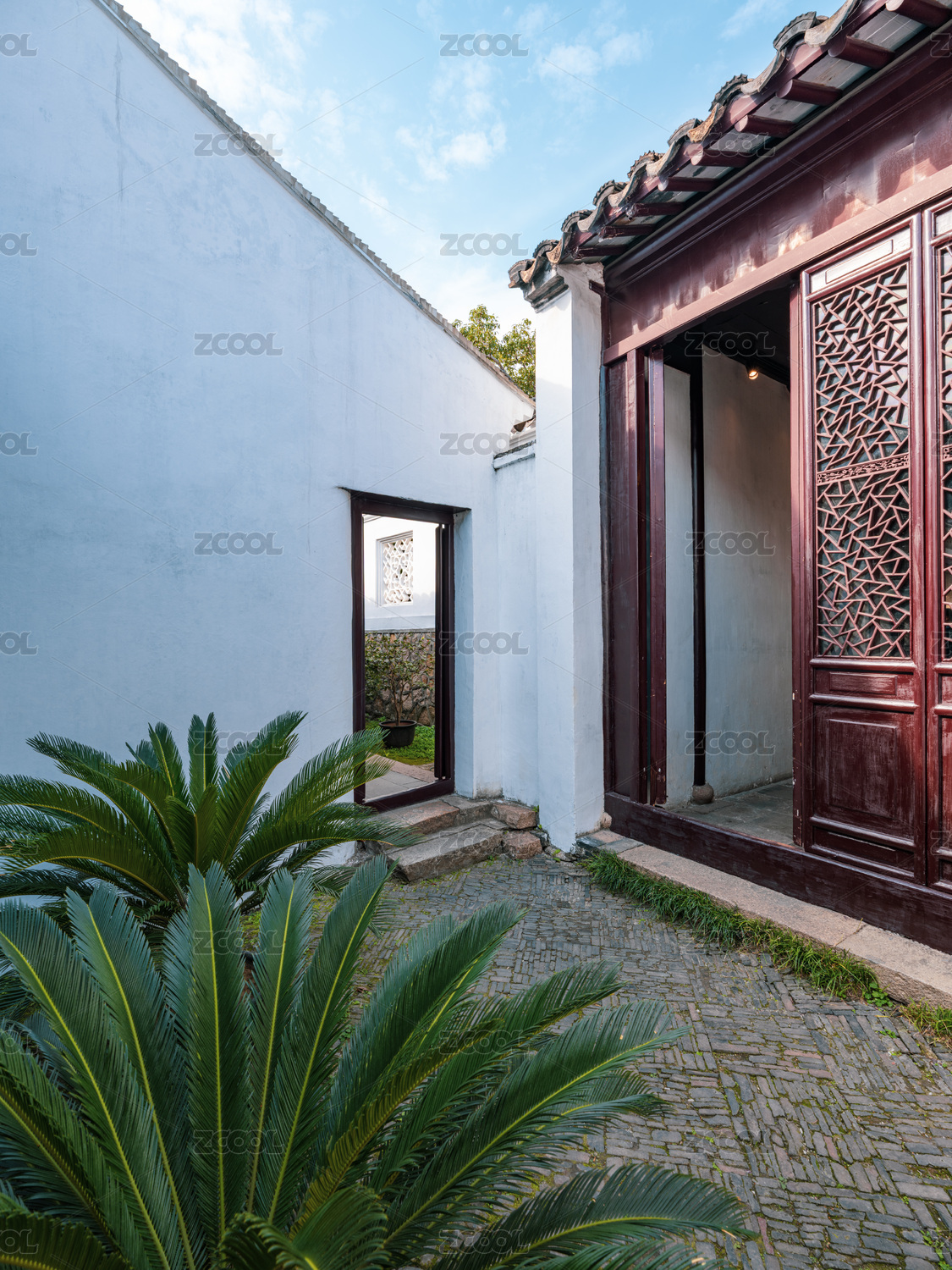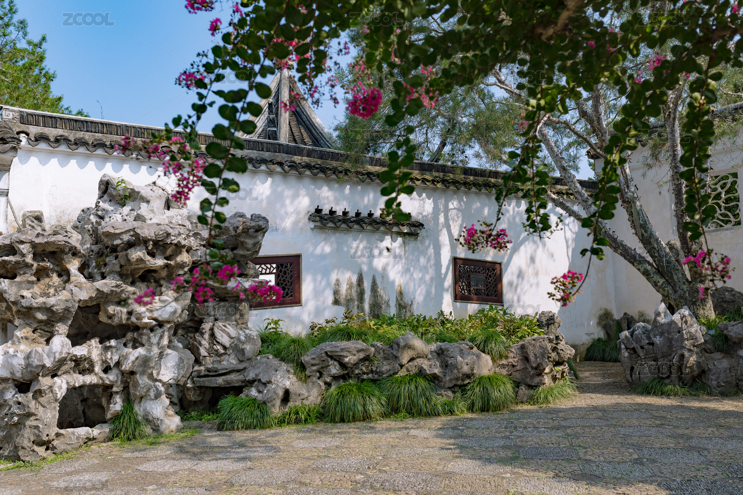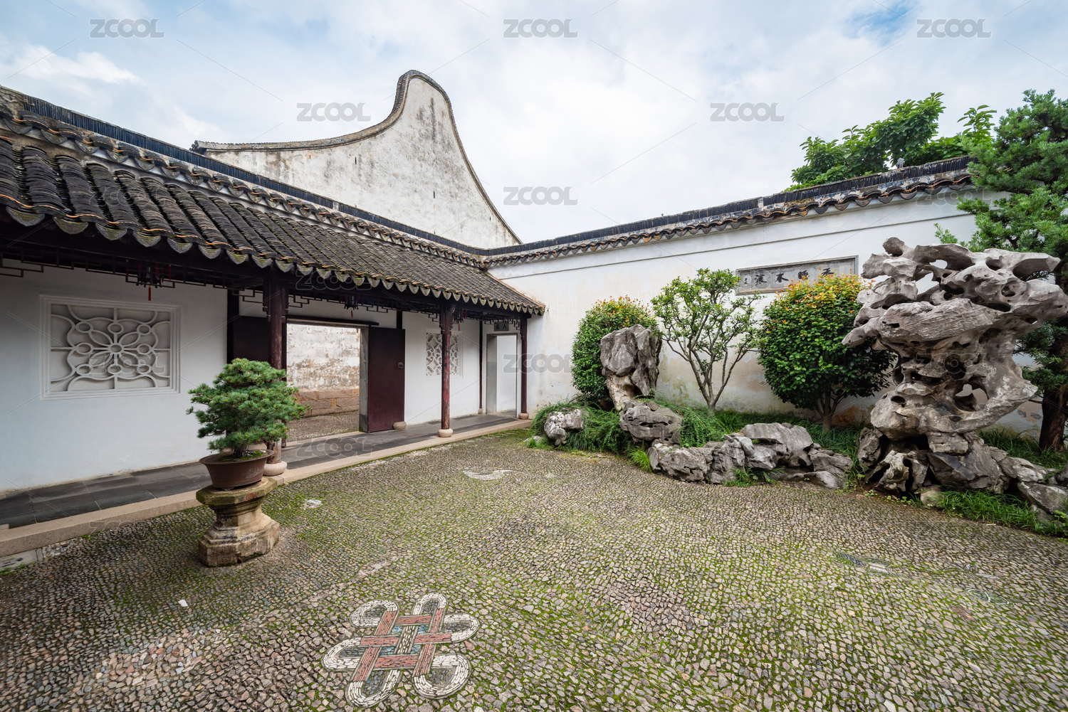 深秋时节苏州网师园亭台楼阁和池塘倒影