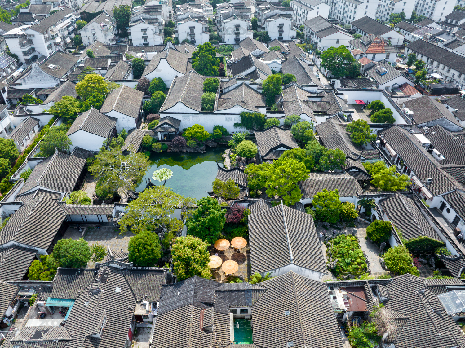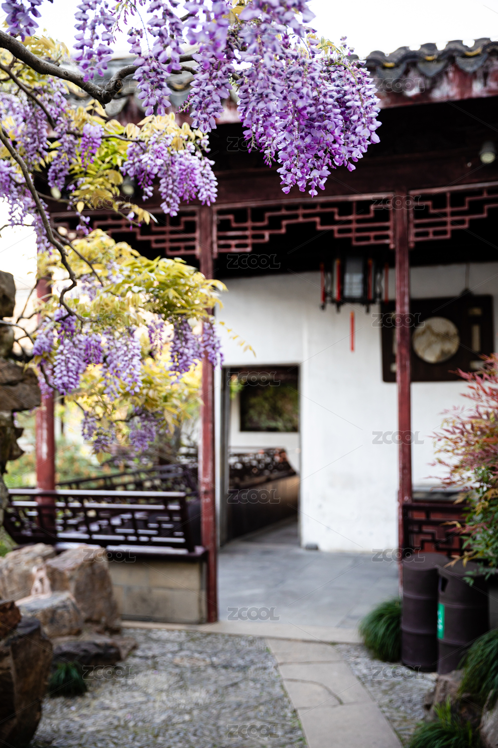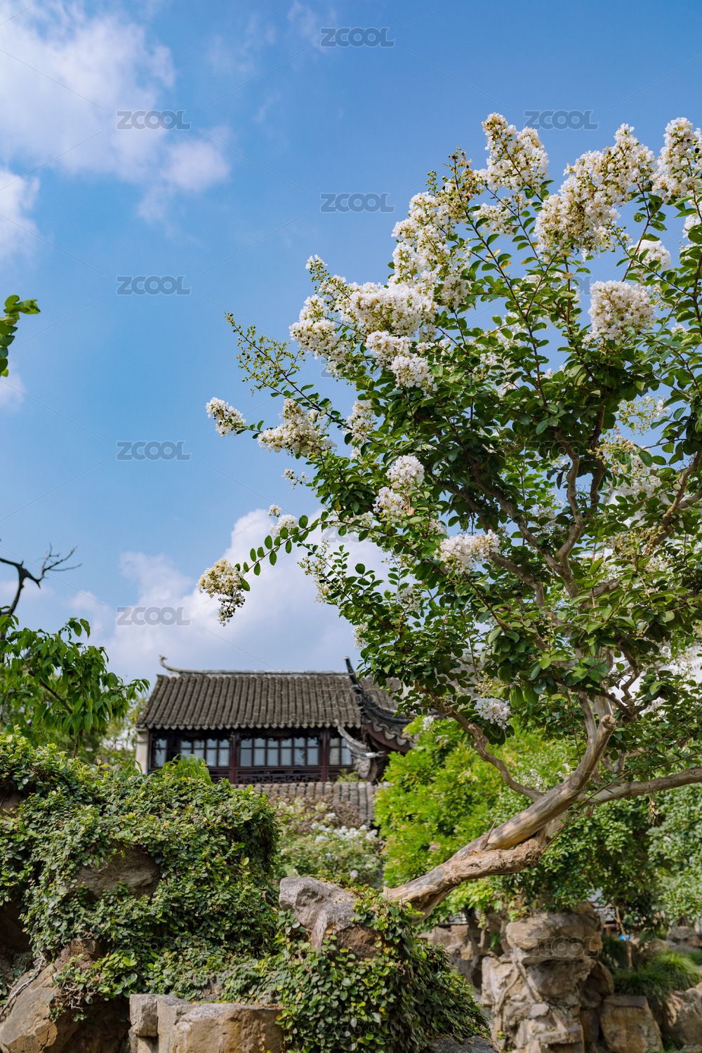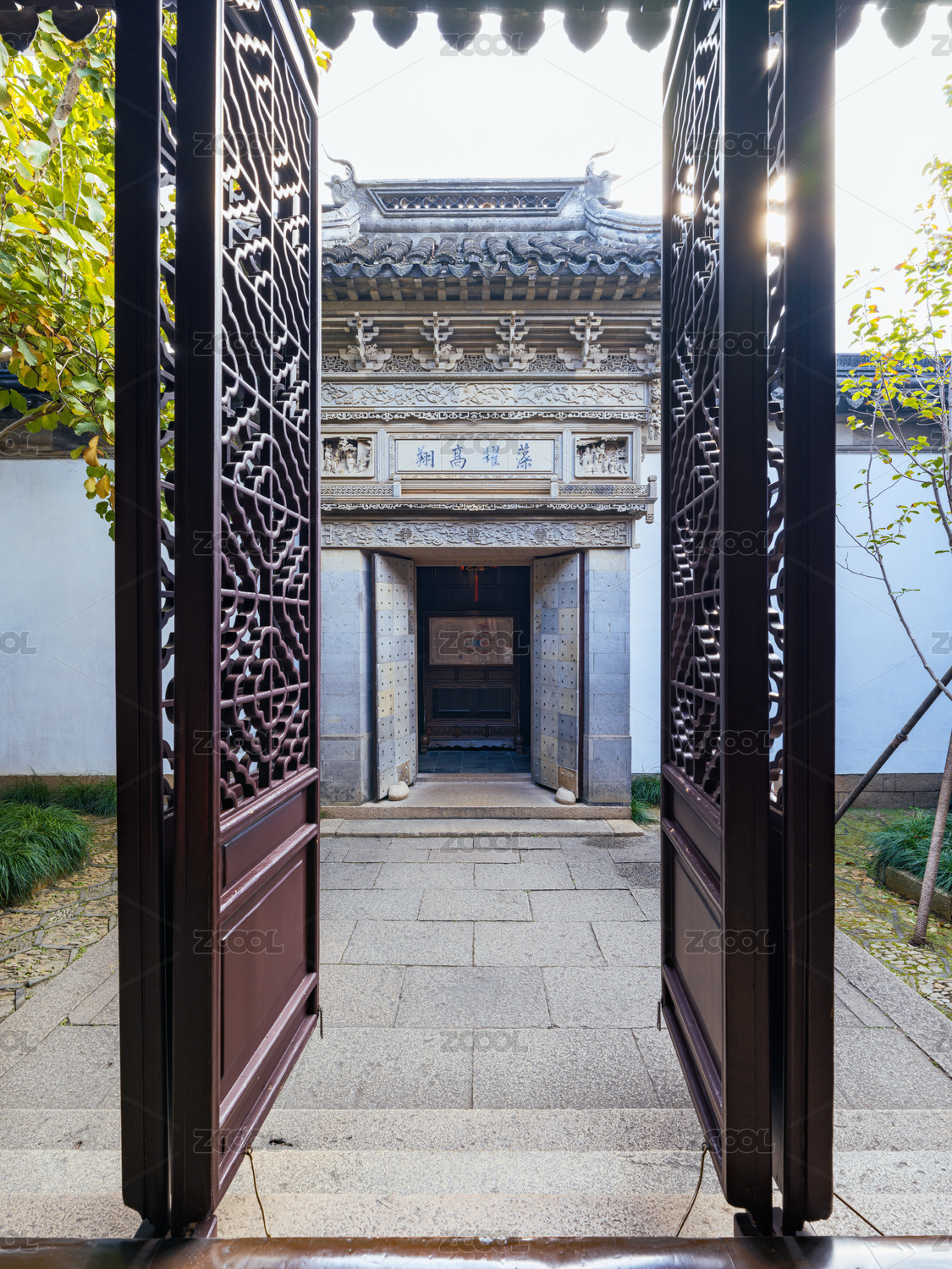 深秋时节苏州网师园亭台楼阁和池塘倒影