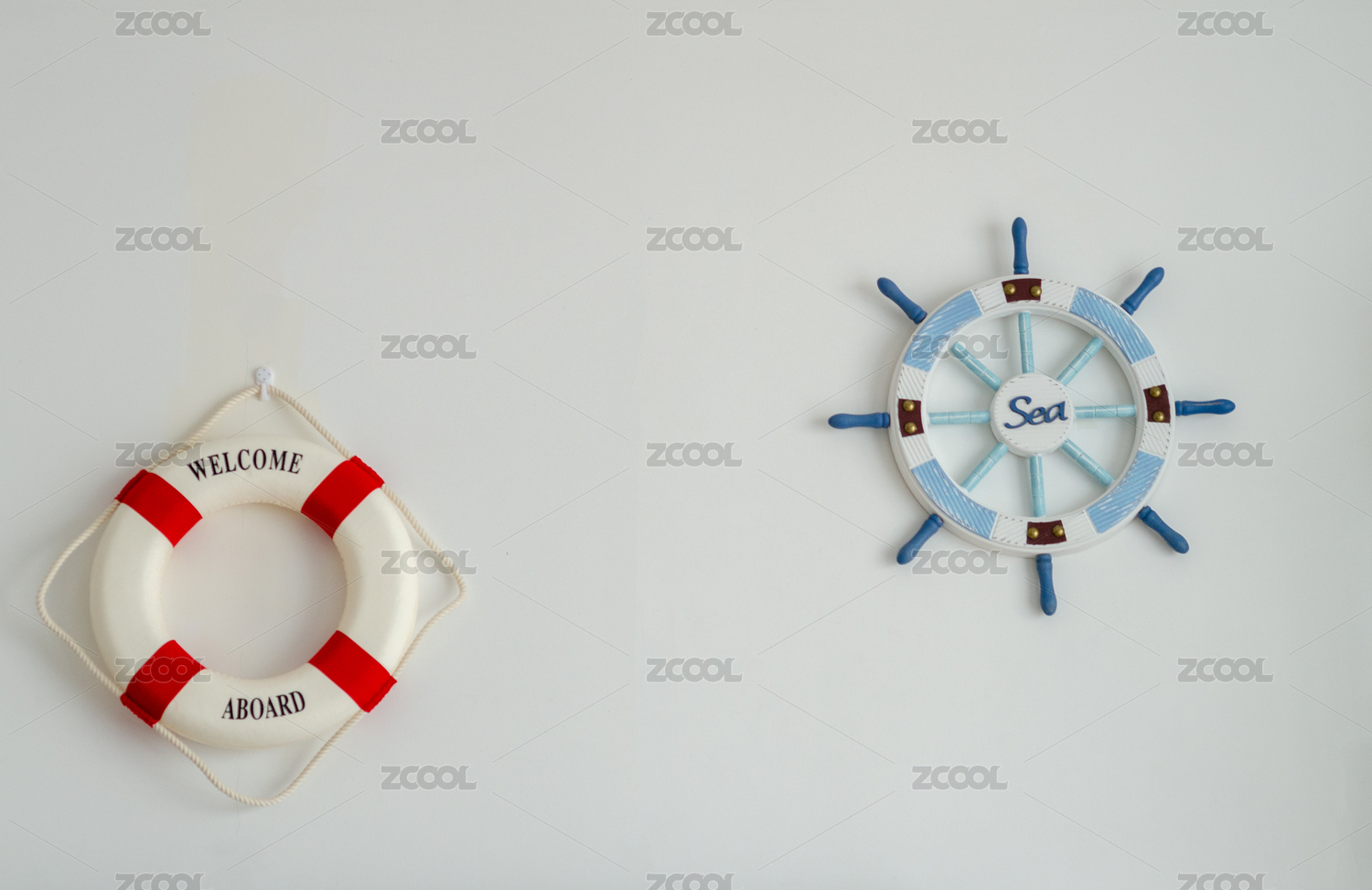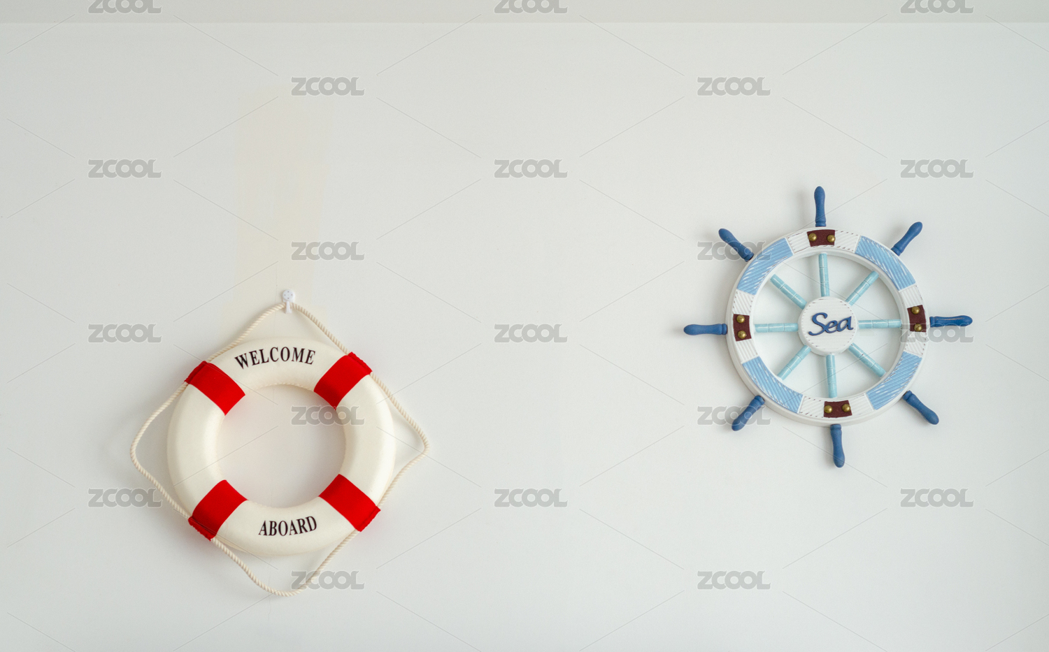 白墙上挂的航海主题装饰物