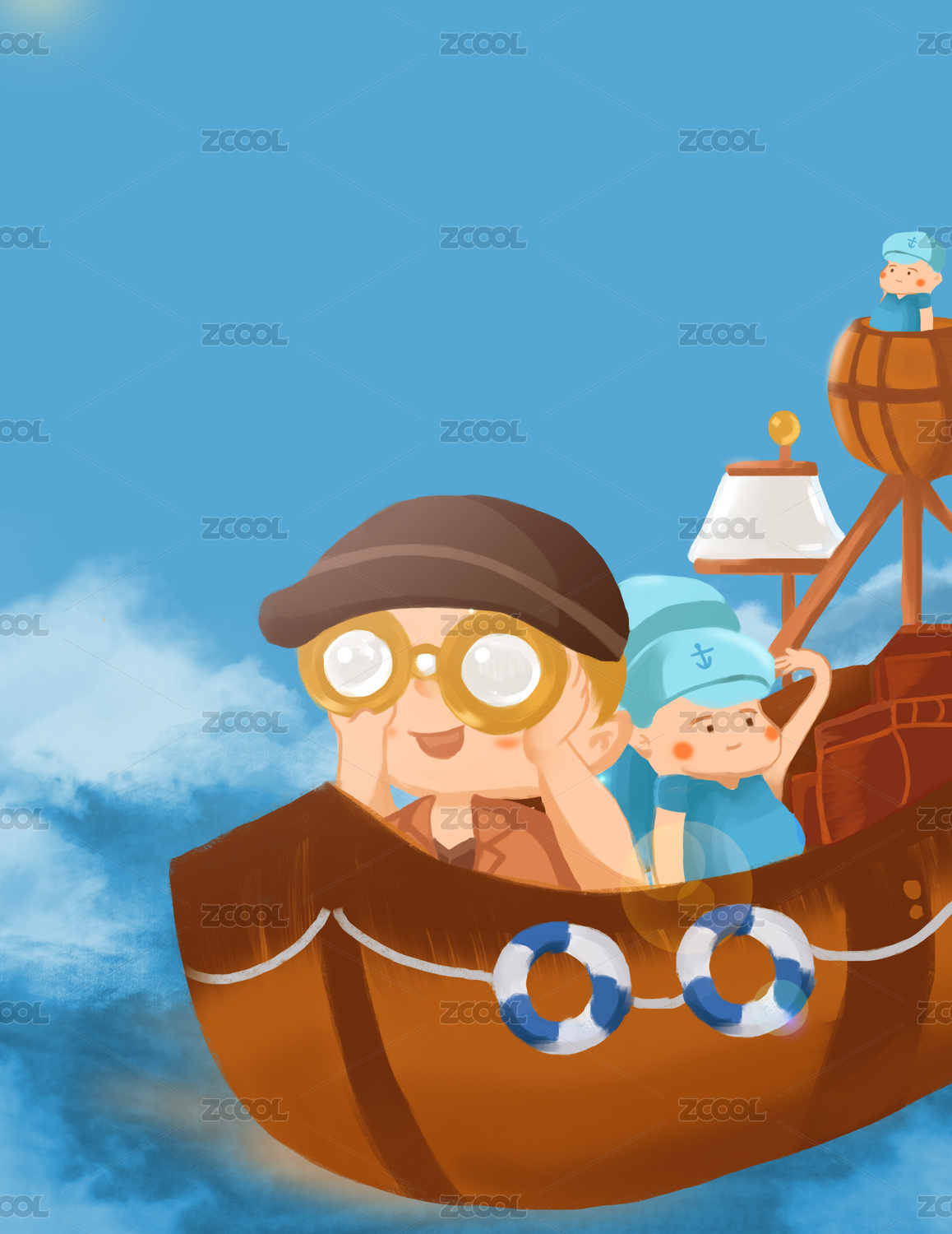 蓝天下出海冒险开着轮船的航海男孩