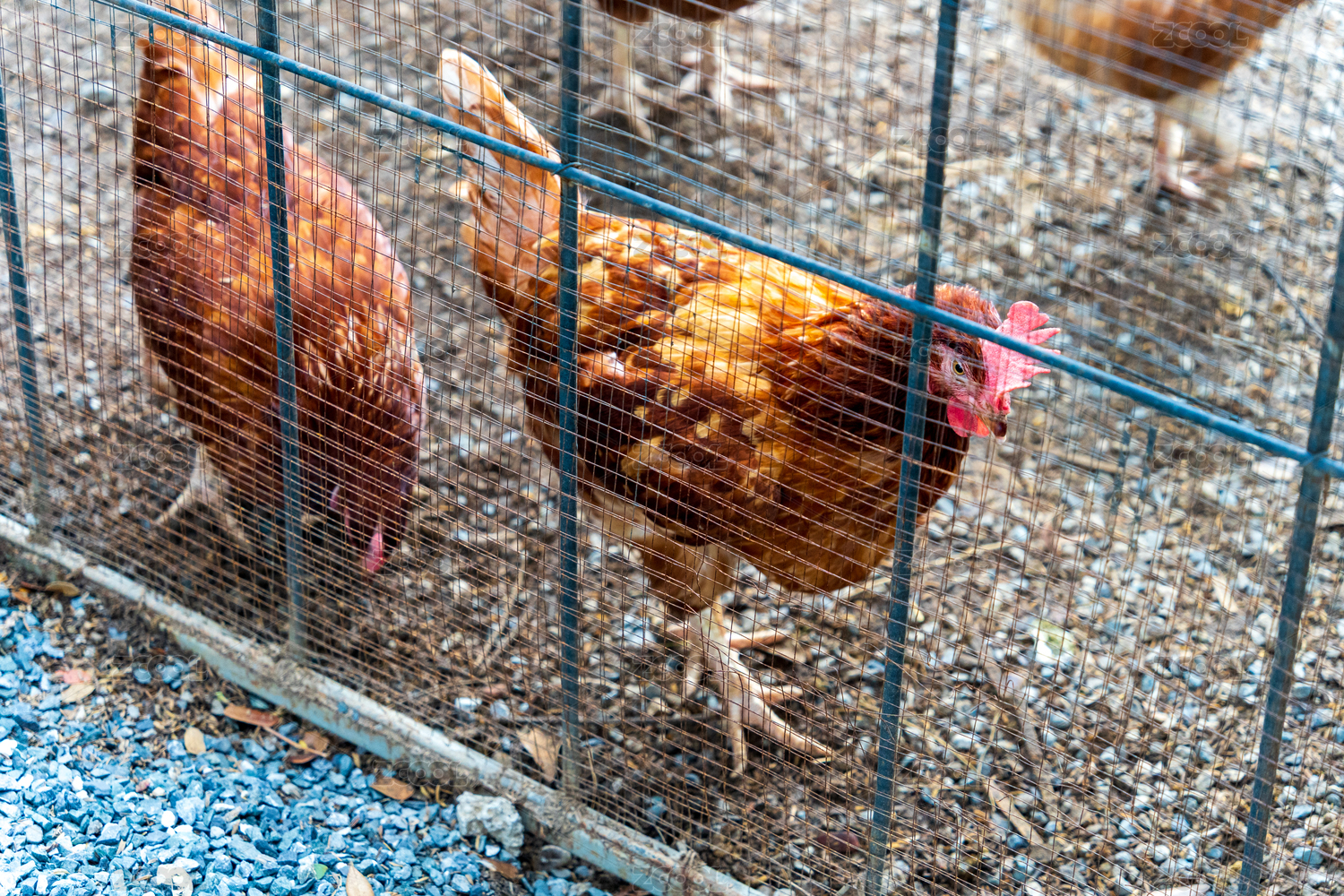 鸡舍里隔着铁丝网在稻壳上休息的母鸡