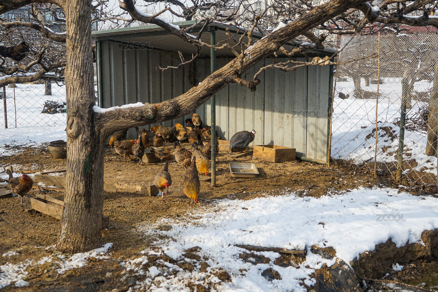 乡村的鸡舍下雪