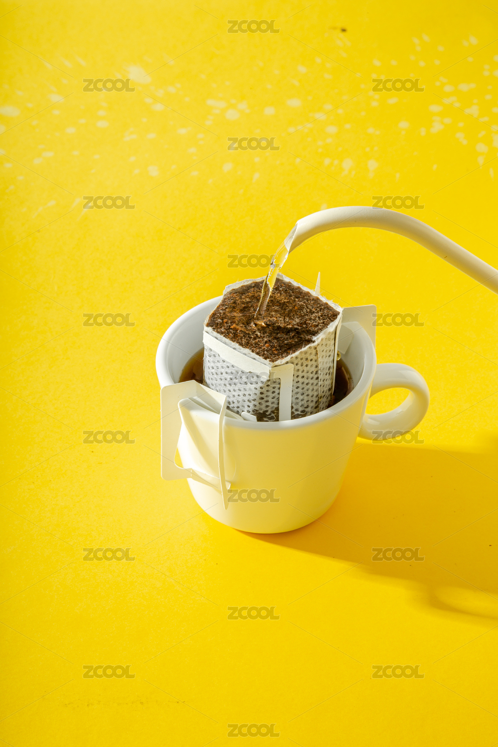 黄色桌面上有一杯正在冲泡的挂耳咖啡