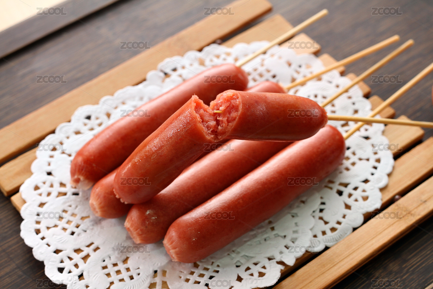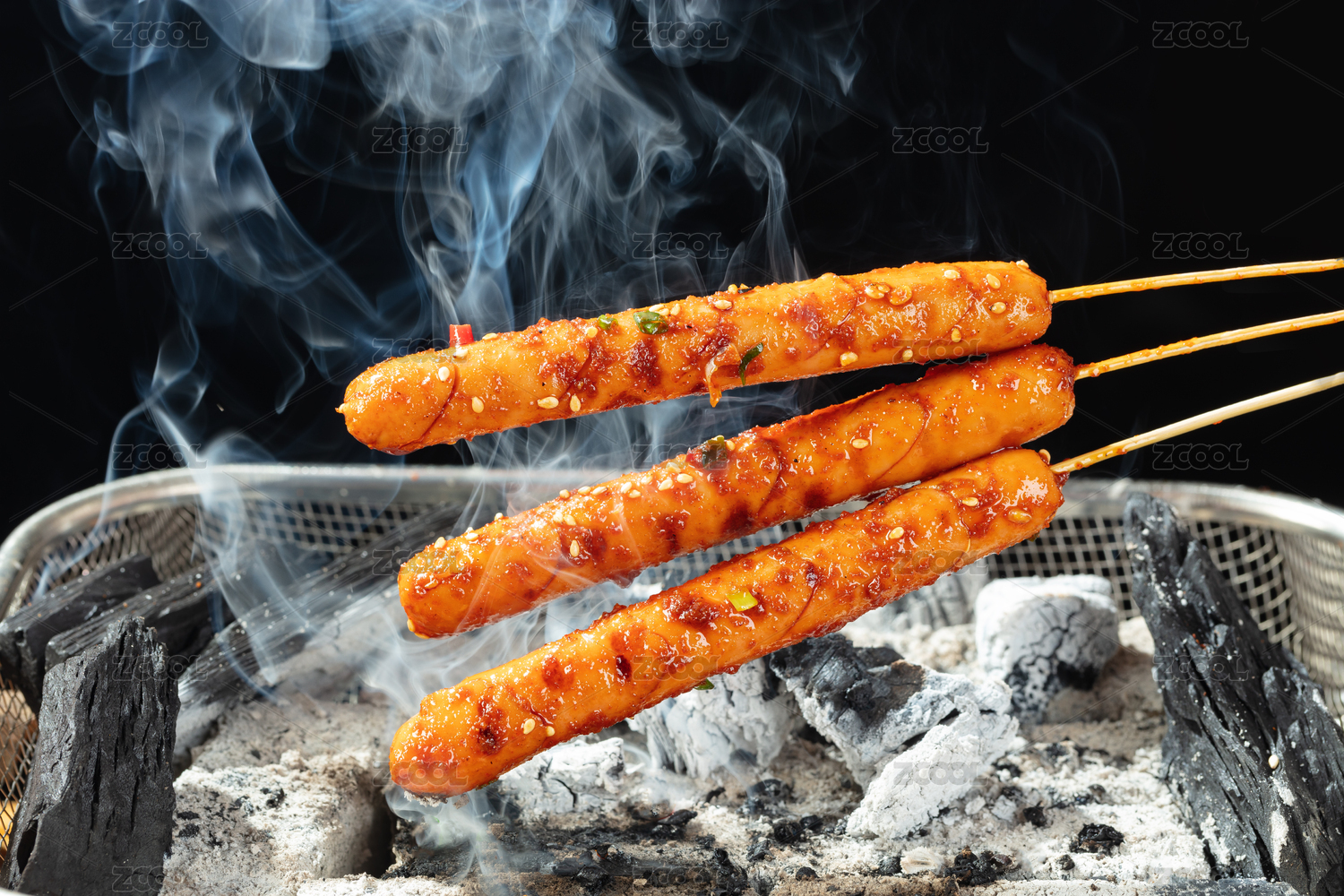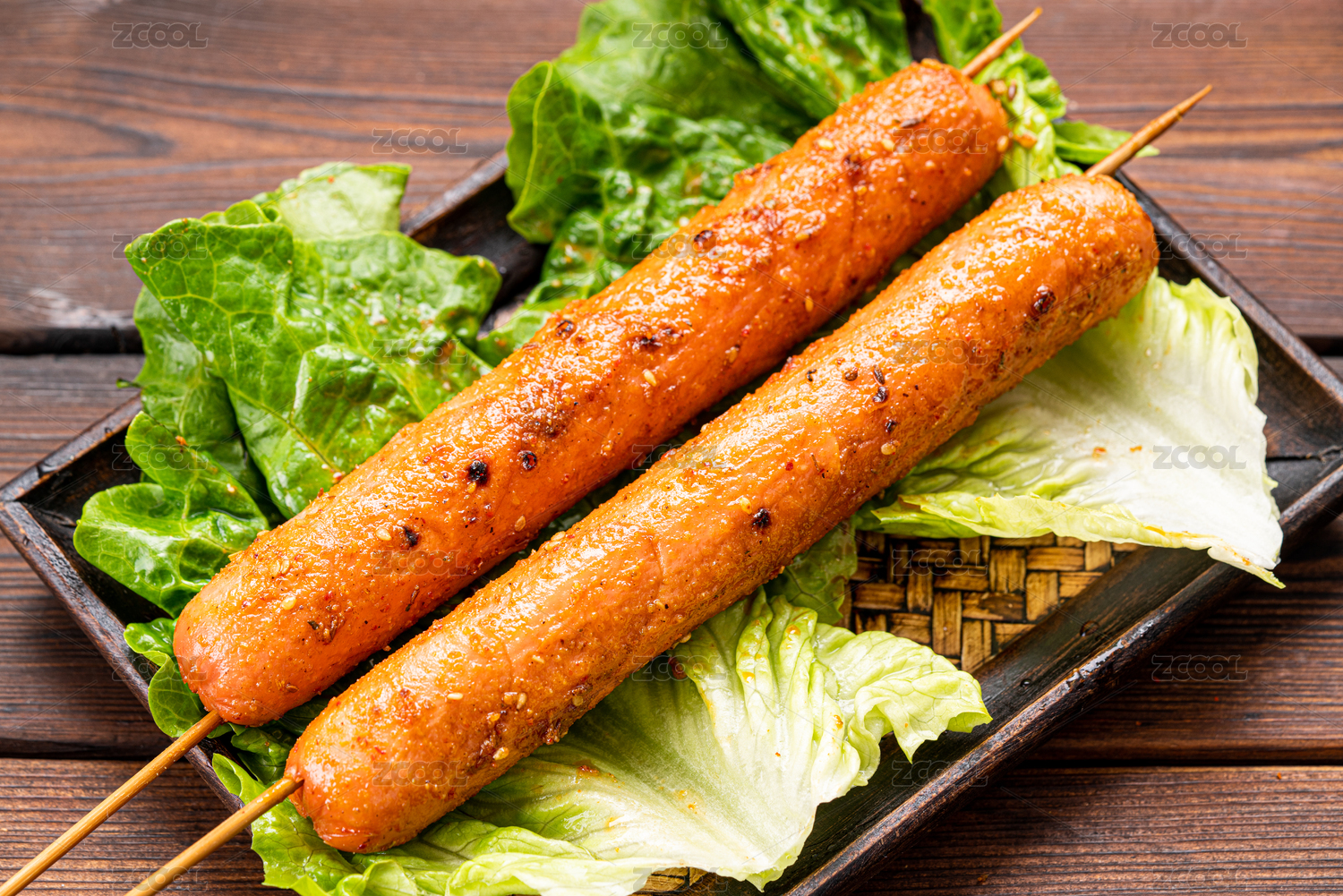 竹签串着的烧烤麻辣烤串烤火腿肠