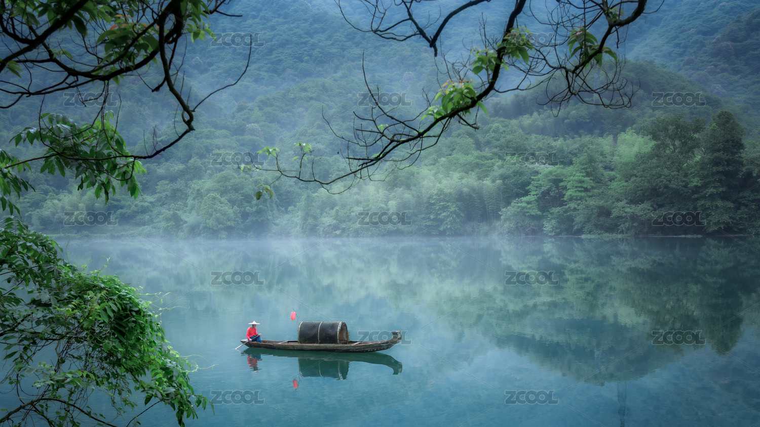 湖南郴州小东江水面上浓雾中俯拍的植物和倒影