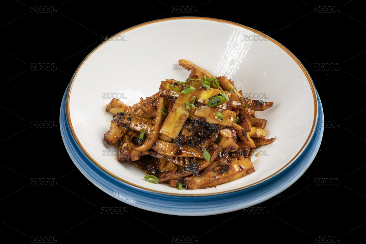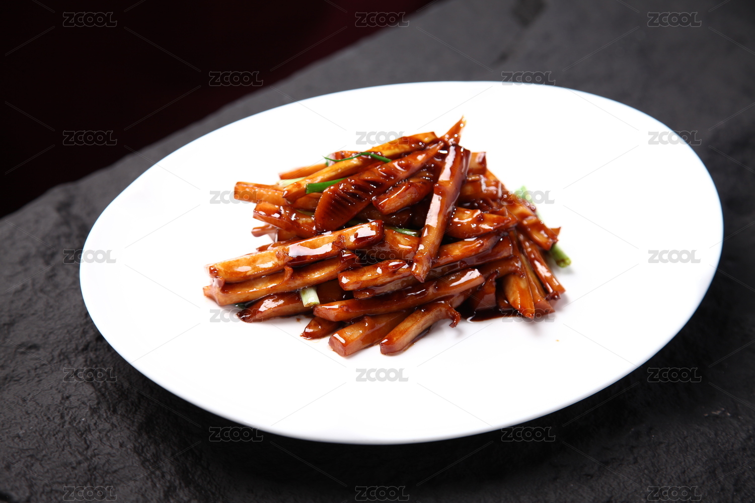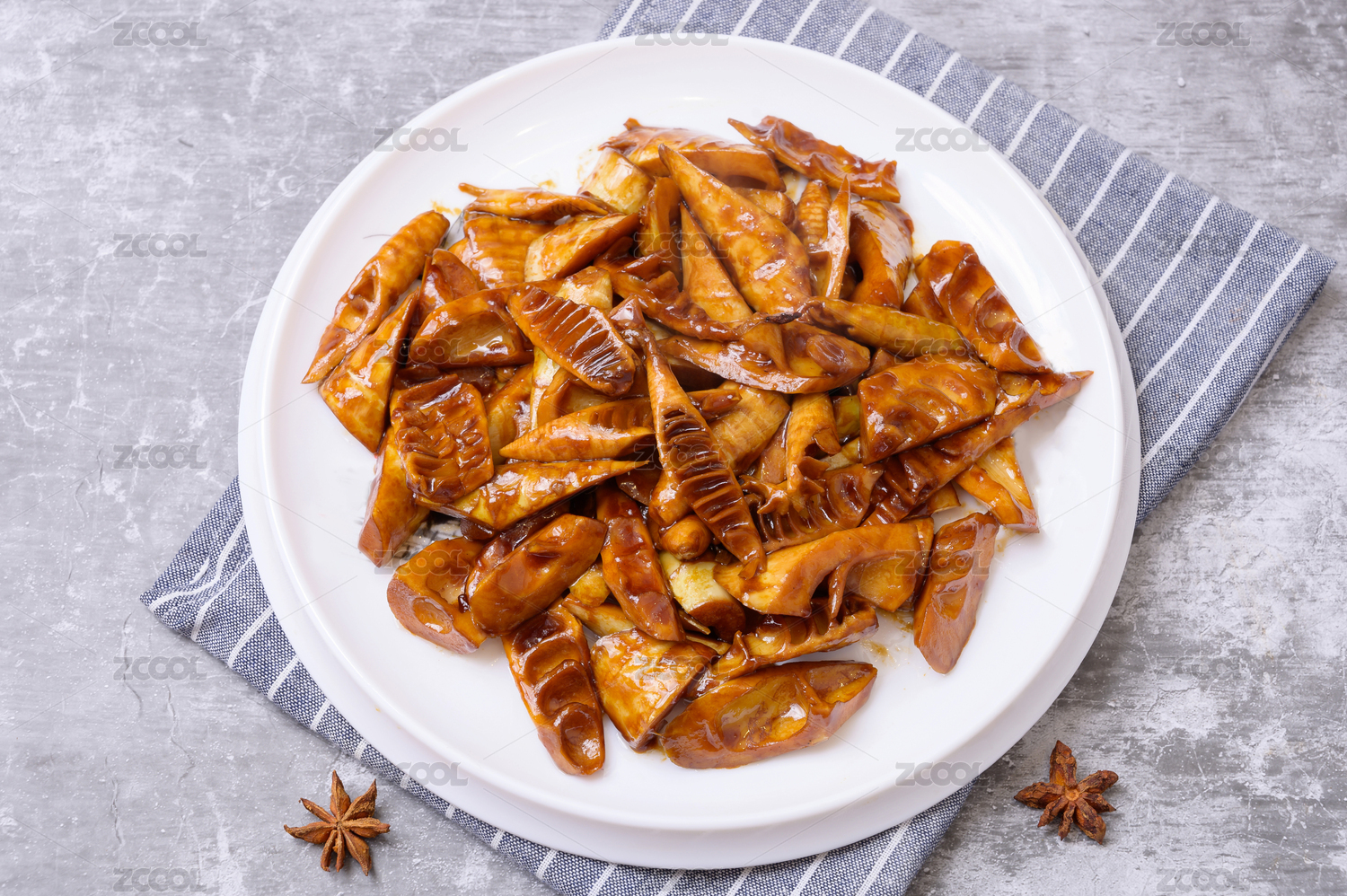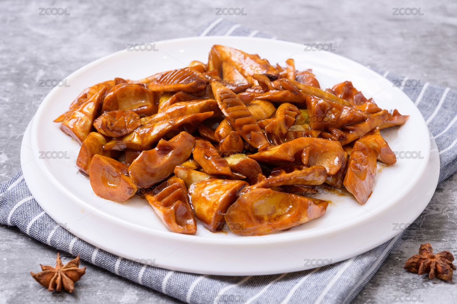 白色盘子黑色背景下江南地区特色菜油焖鲜笋