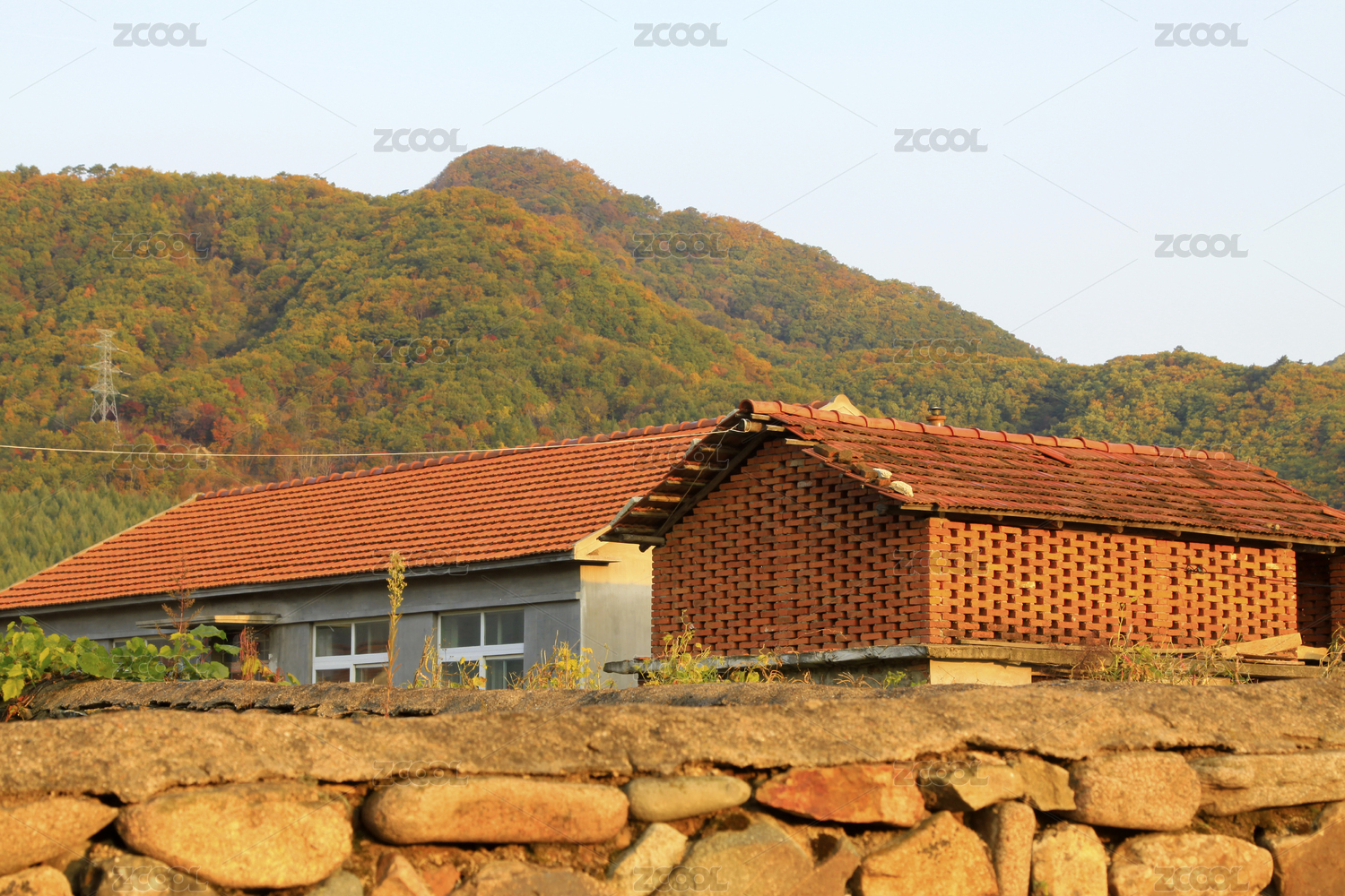 山间砖瓦房与石墙