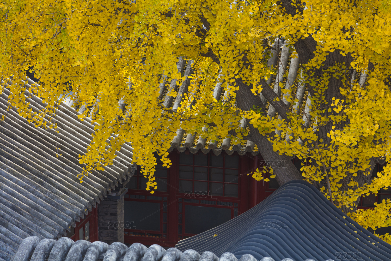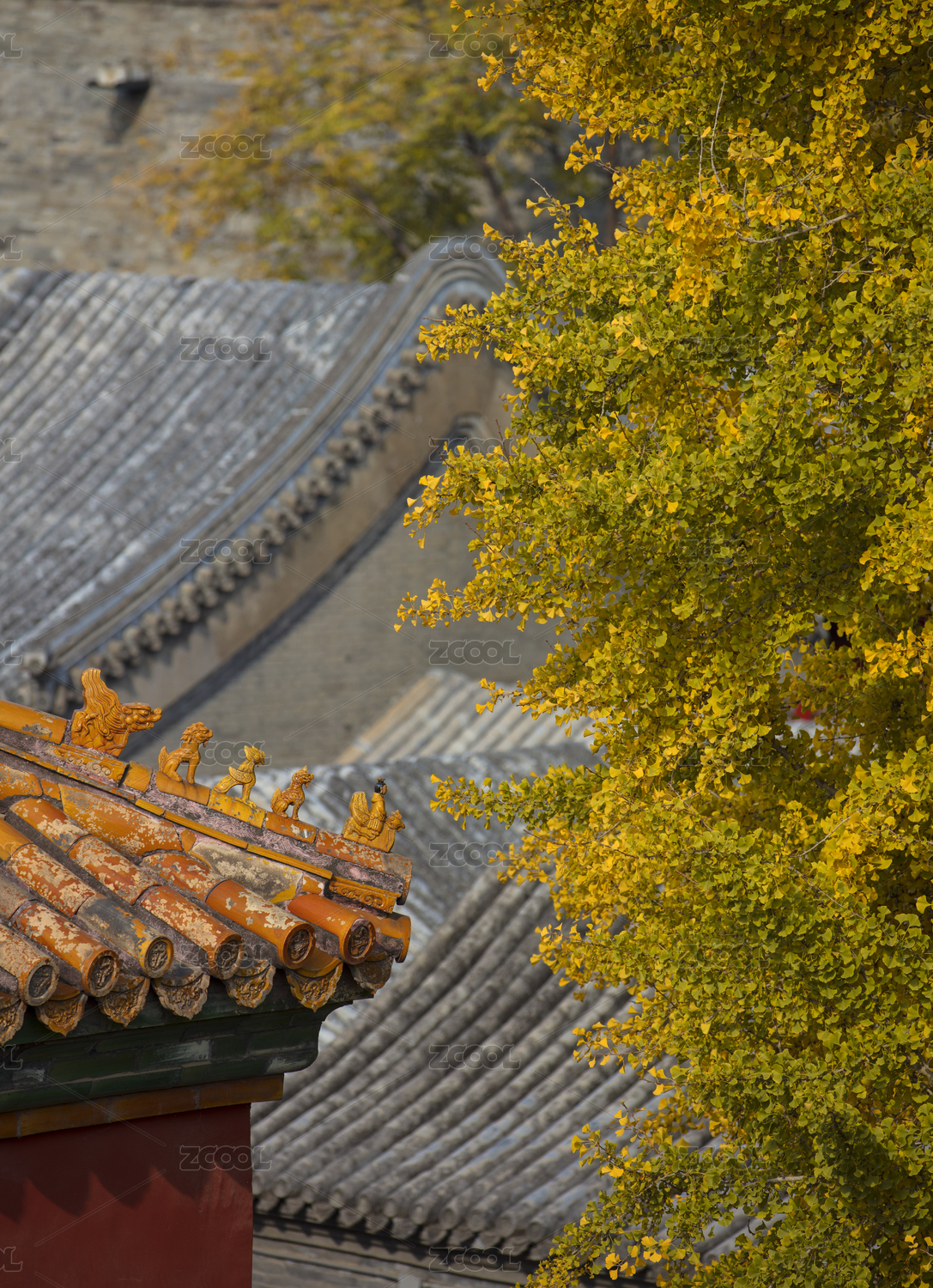 北京故宫秋天的砖瓦房和银杏树