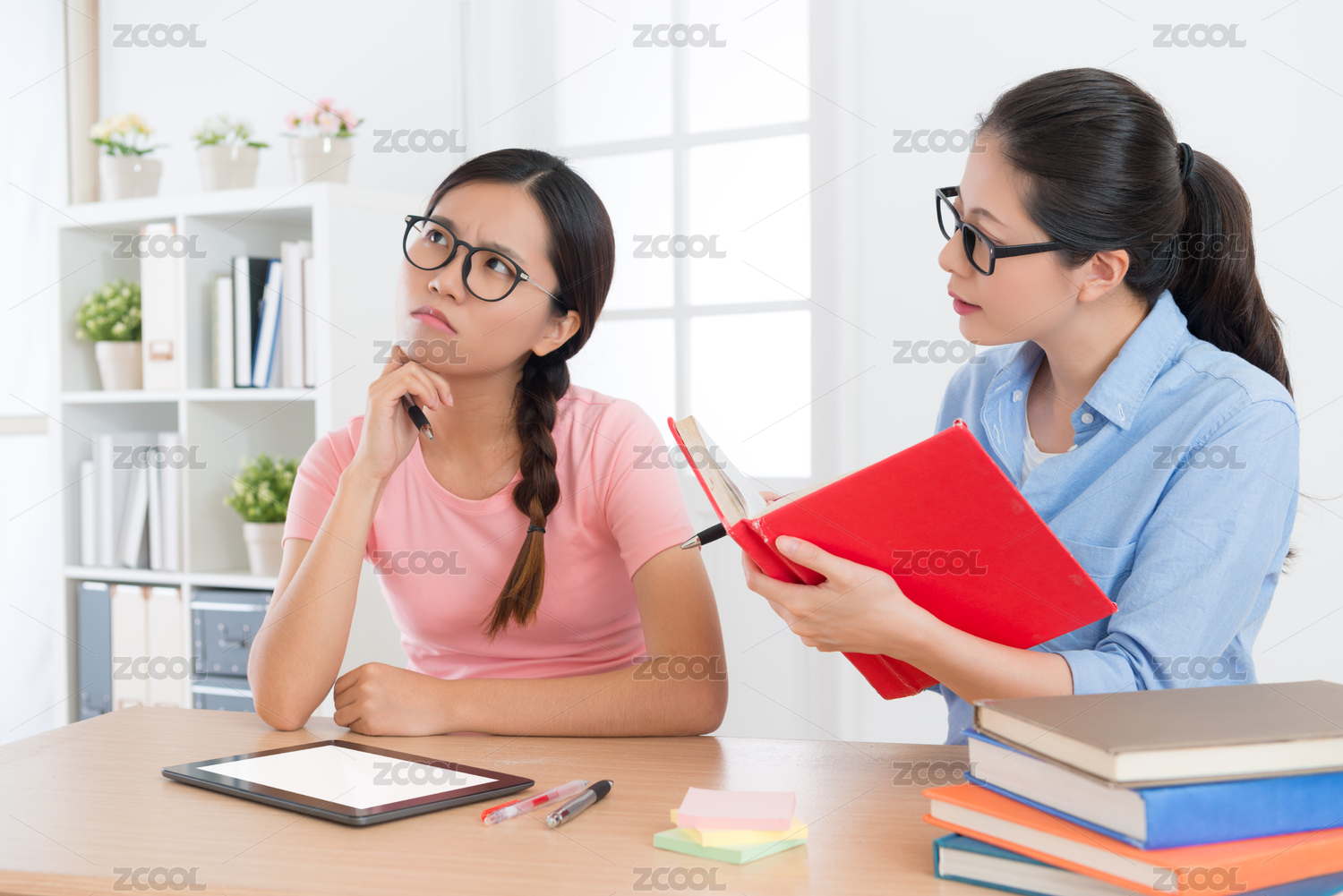当她的家庭教师拿着学校的教育书籍,询问的问题来测试学习成果年轻漂亮的女学生的思维研究问题的答案感到困惑。