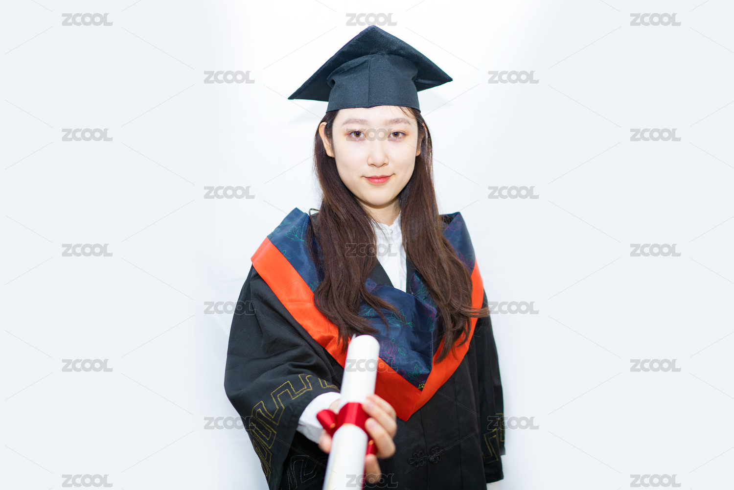 一个中国女毕业生穿着毕业服装拿着证书象征着考证的成功与教育的结业成果