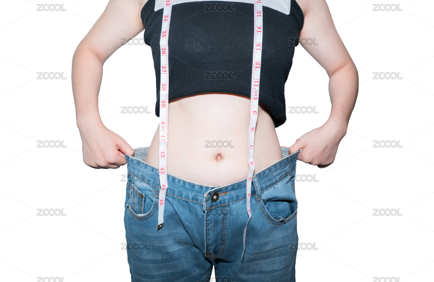 白色背景棚拍下一个美女女孩展示自己减肥的成果窈窕苗条细腰腰部线条运动减肥瘦身塑形