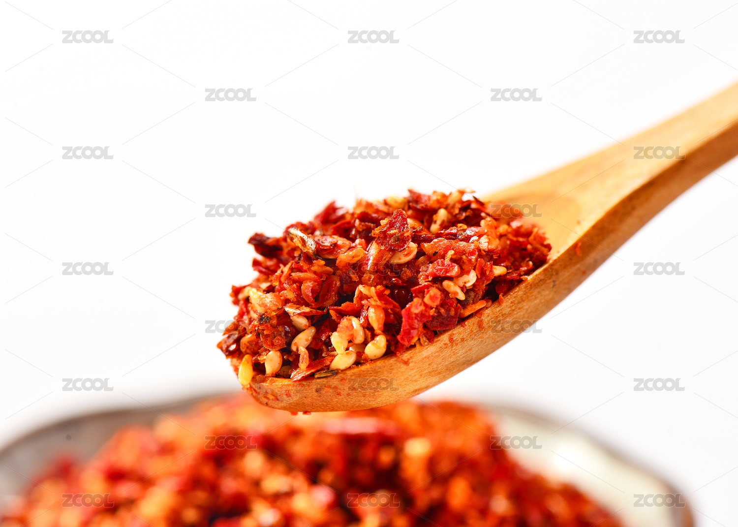 白底上放着一盘烧烤辣椒粉和一勺辣椒粉