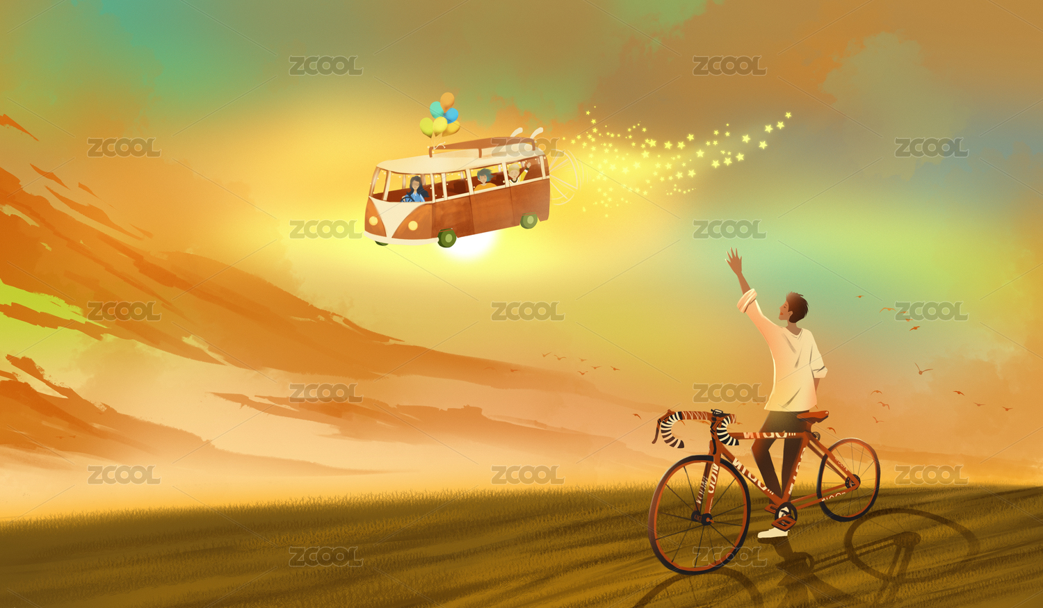 单车少年和开飞车而来的朋友 奇幻旅途插画