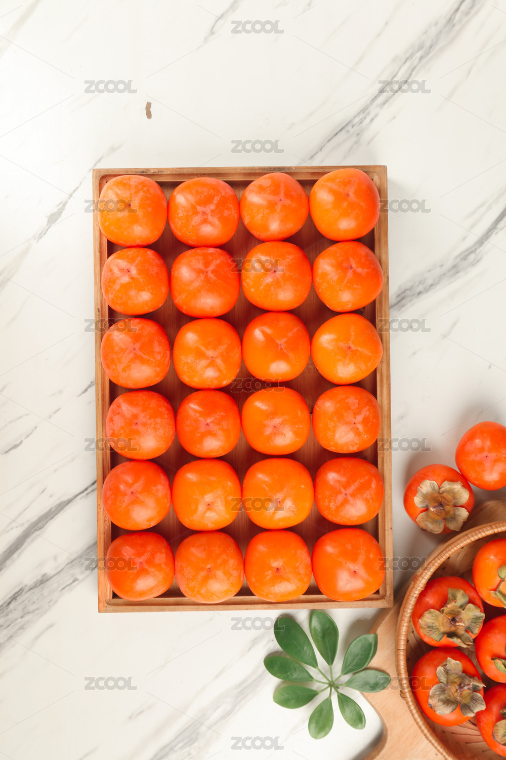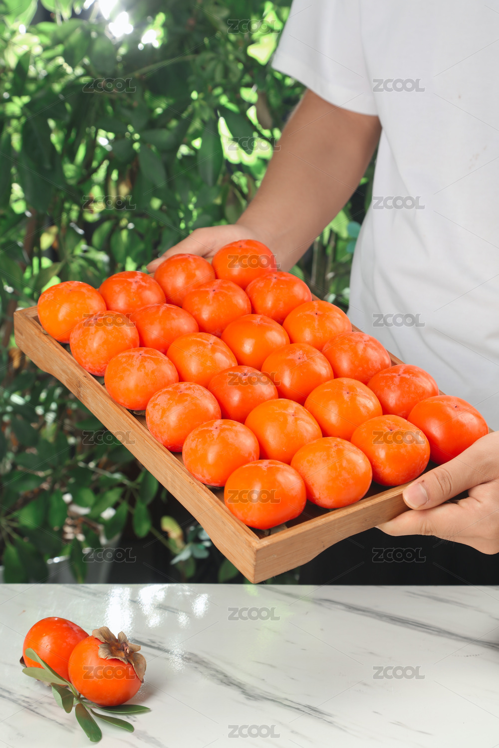 白底上木盘放着水晶柿子和水晶柿子切面