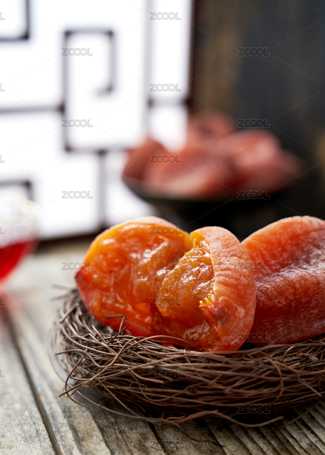 木纹背景上摆放的富平流心水晶柿饼