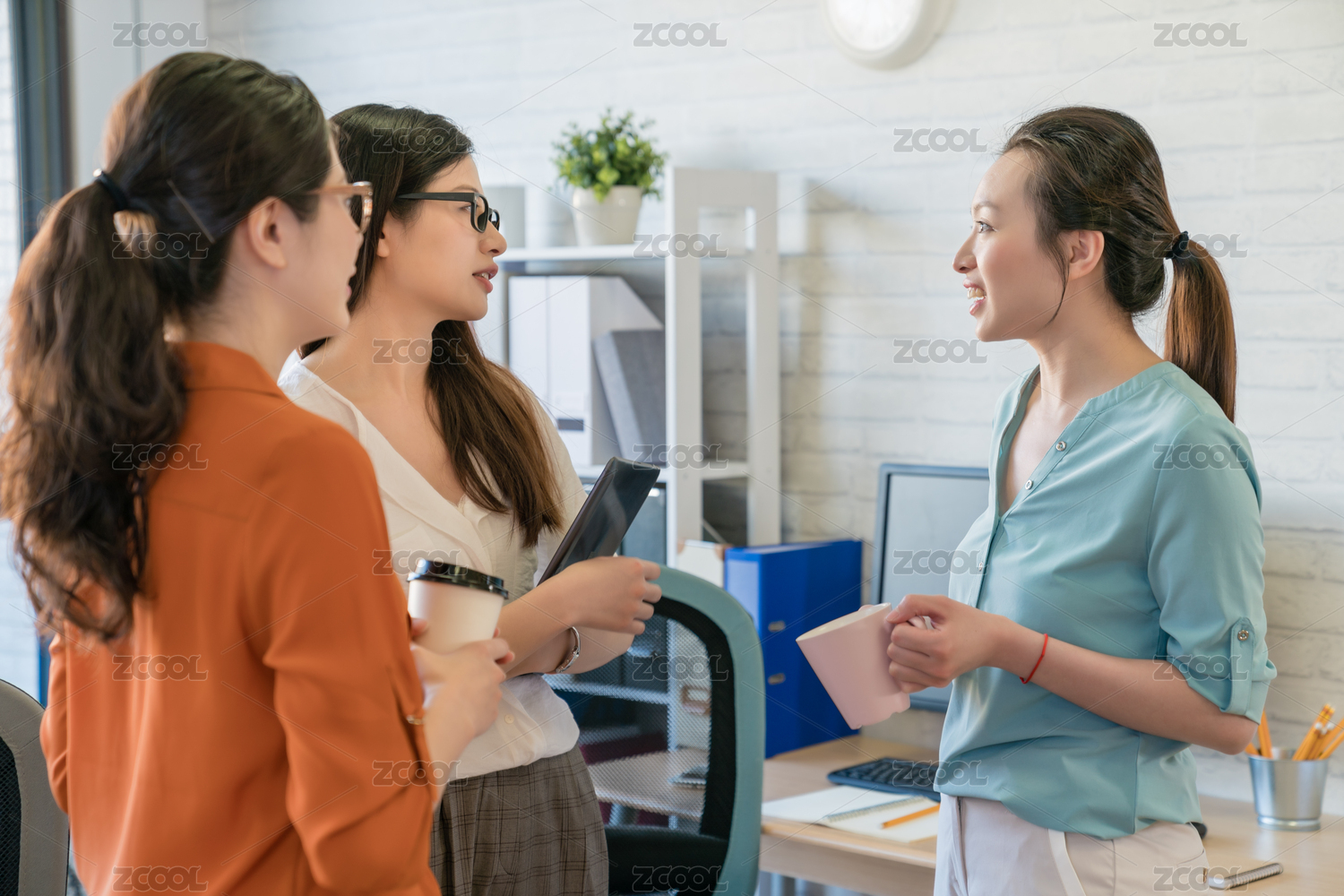 商务人士听,在咖啡休息时间谈论她的同事的图片。