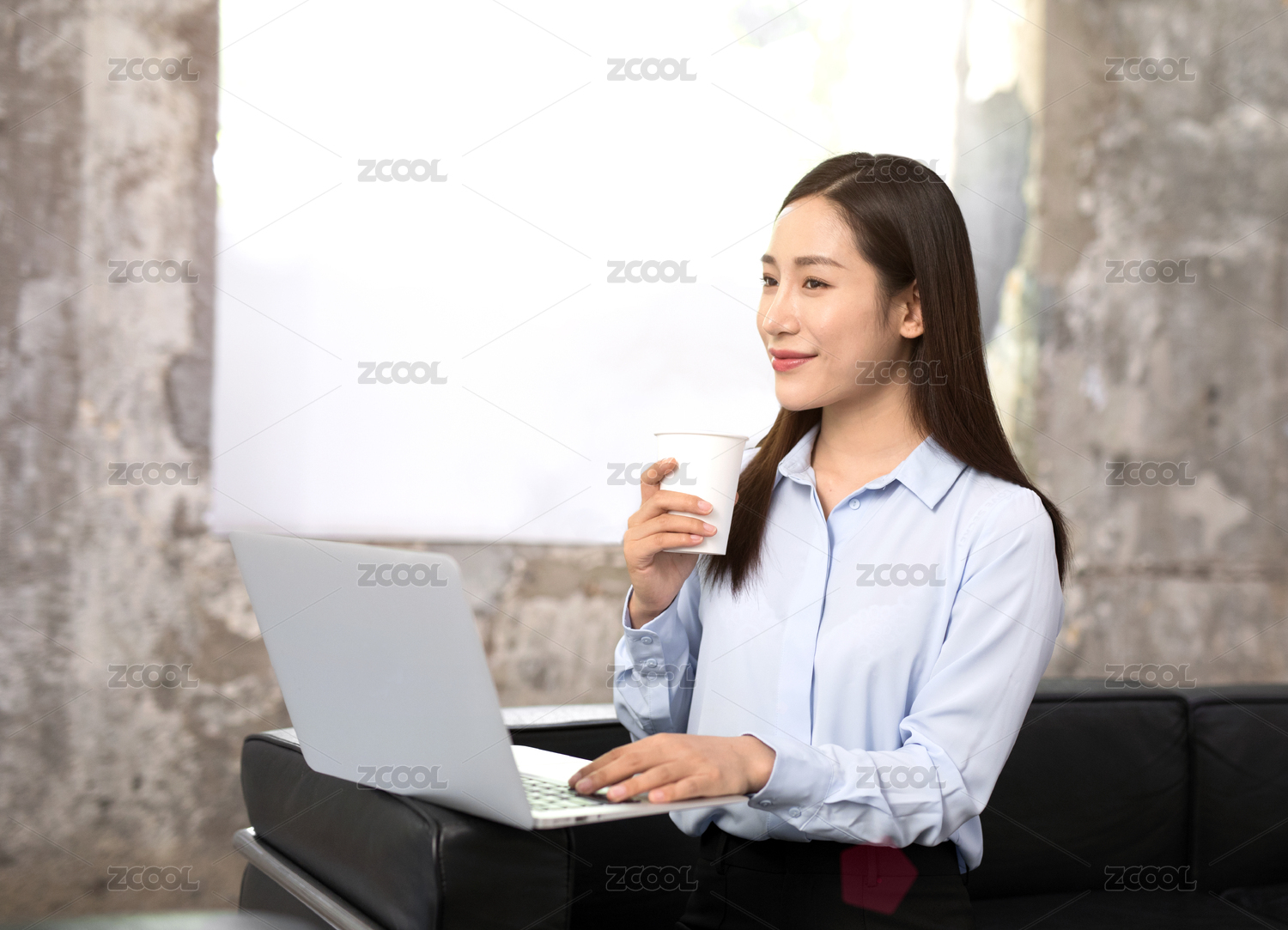 手拿一杯咖啡坐在沙发上腿上放着笔记本电脑工作之余休息一下的年轻女性