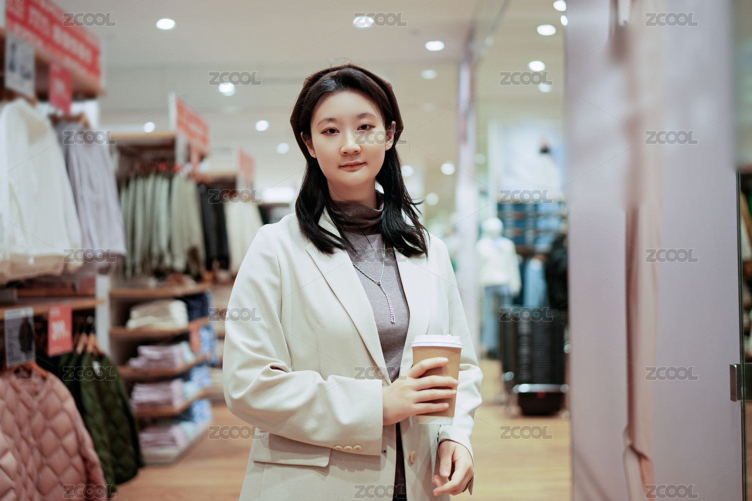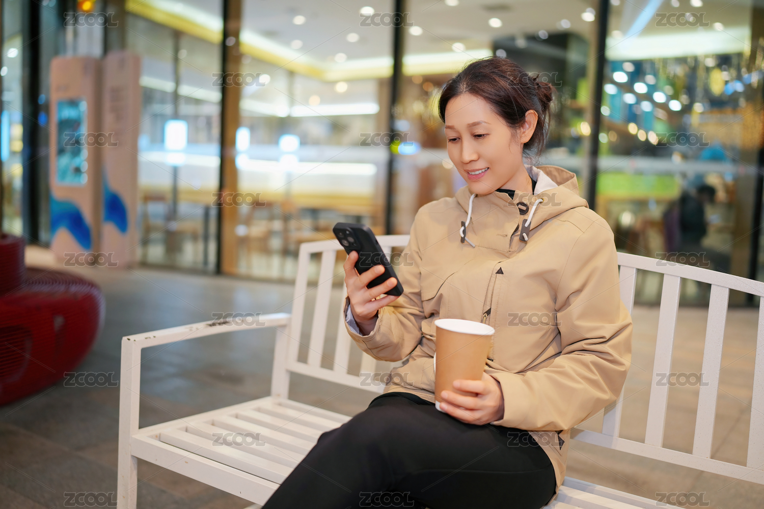 年轻女子在购物中心享受咖啡休息