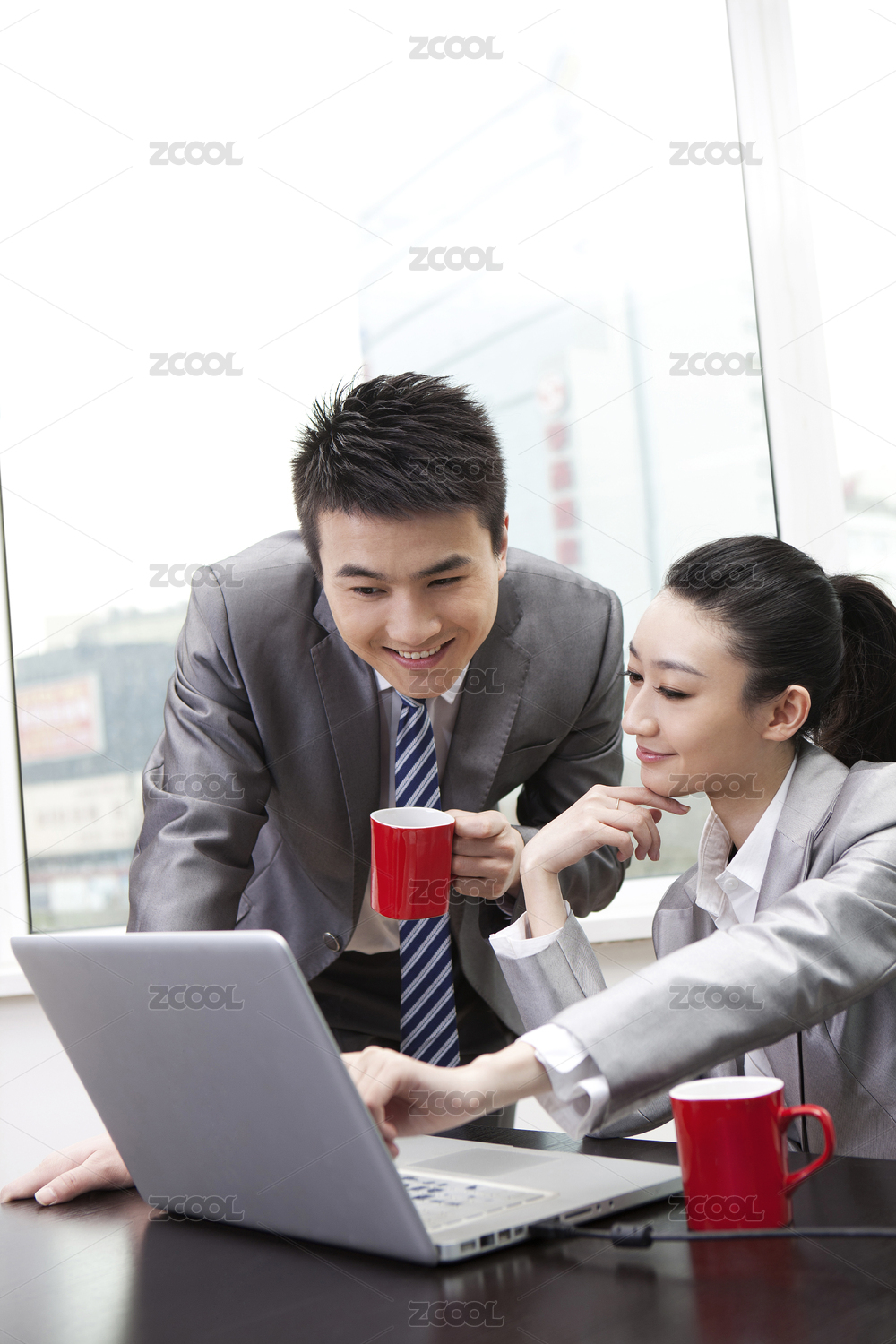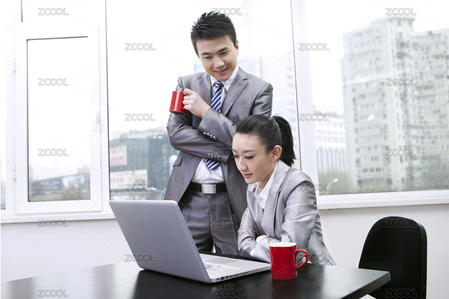 会议室内开会后女性员工正靠在桌子上喝着咖啡休息