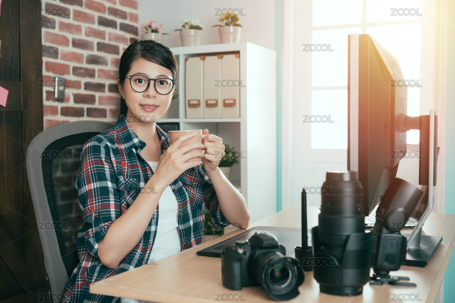 快乐漂亮的女人摄影师面对镜头微笑并坐在办公桌工作喝热的浓咖啡休息在下午茶时间放松。