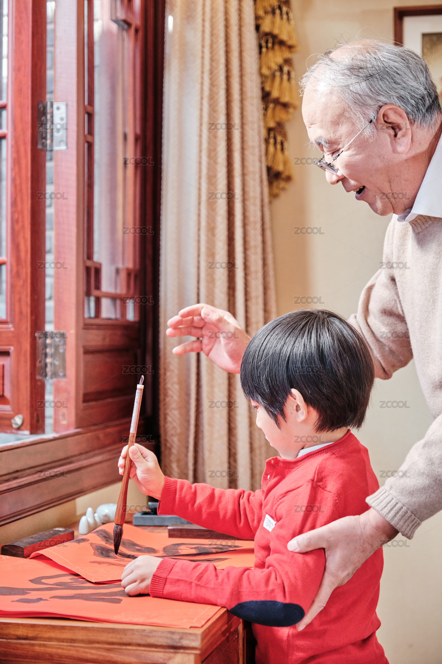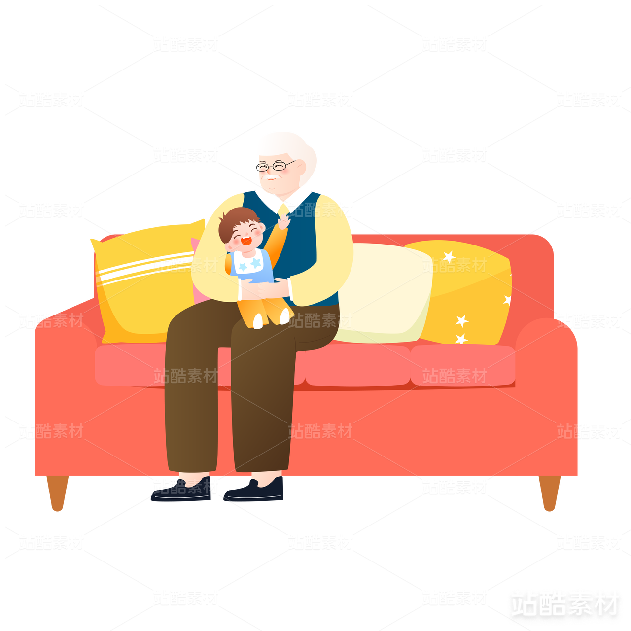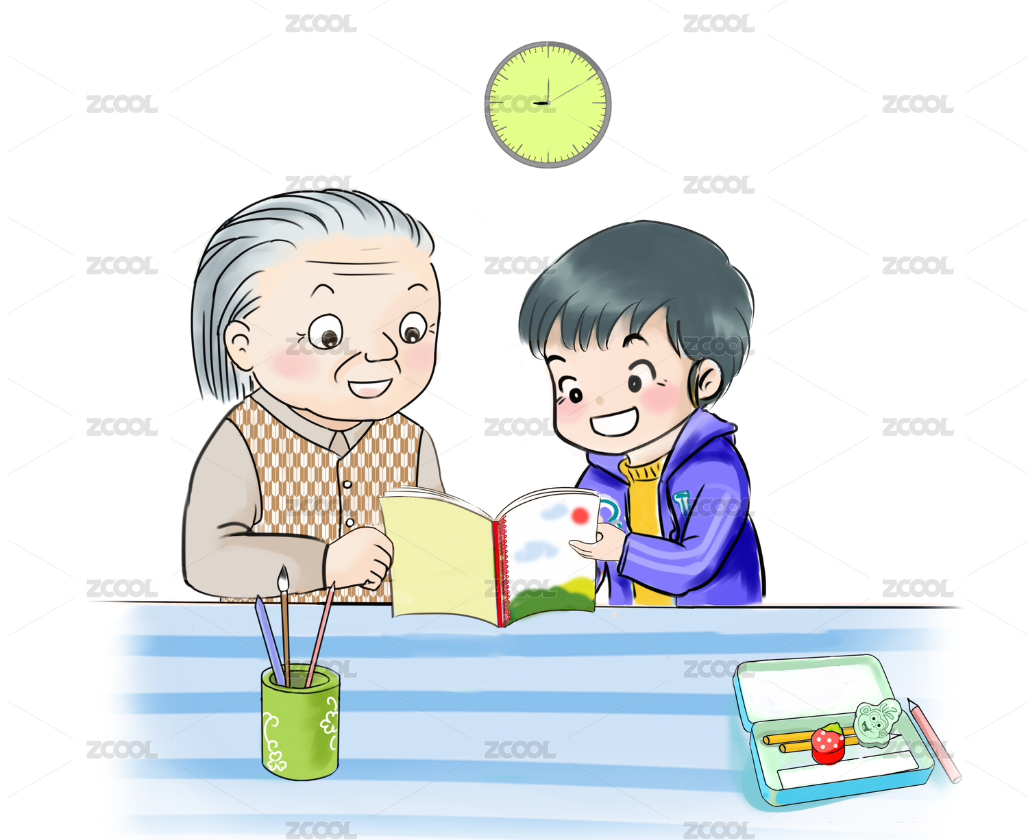 住宅客厅中孙子指导爷爷坐在沙发上学习读书识字插画