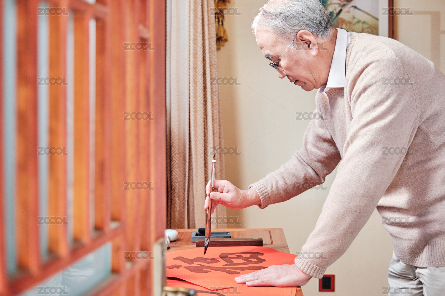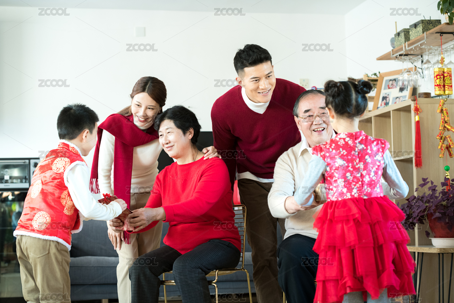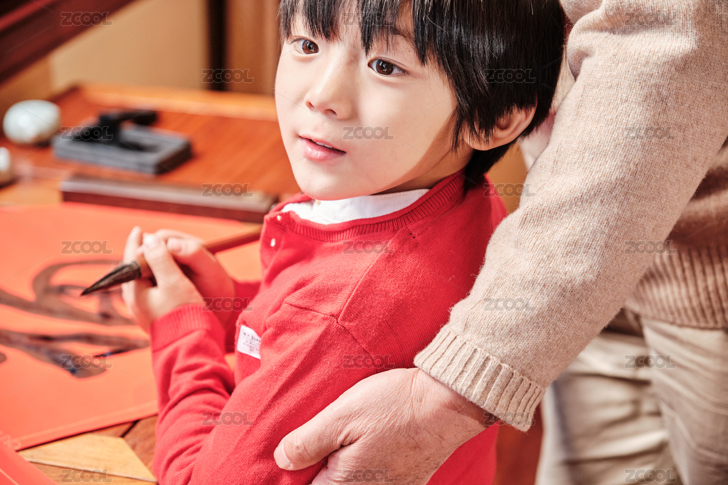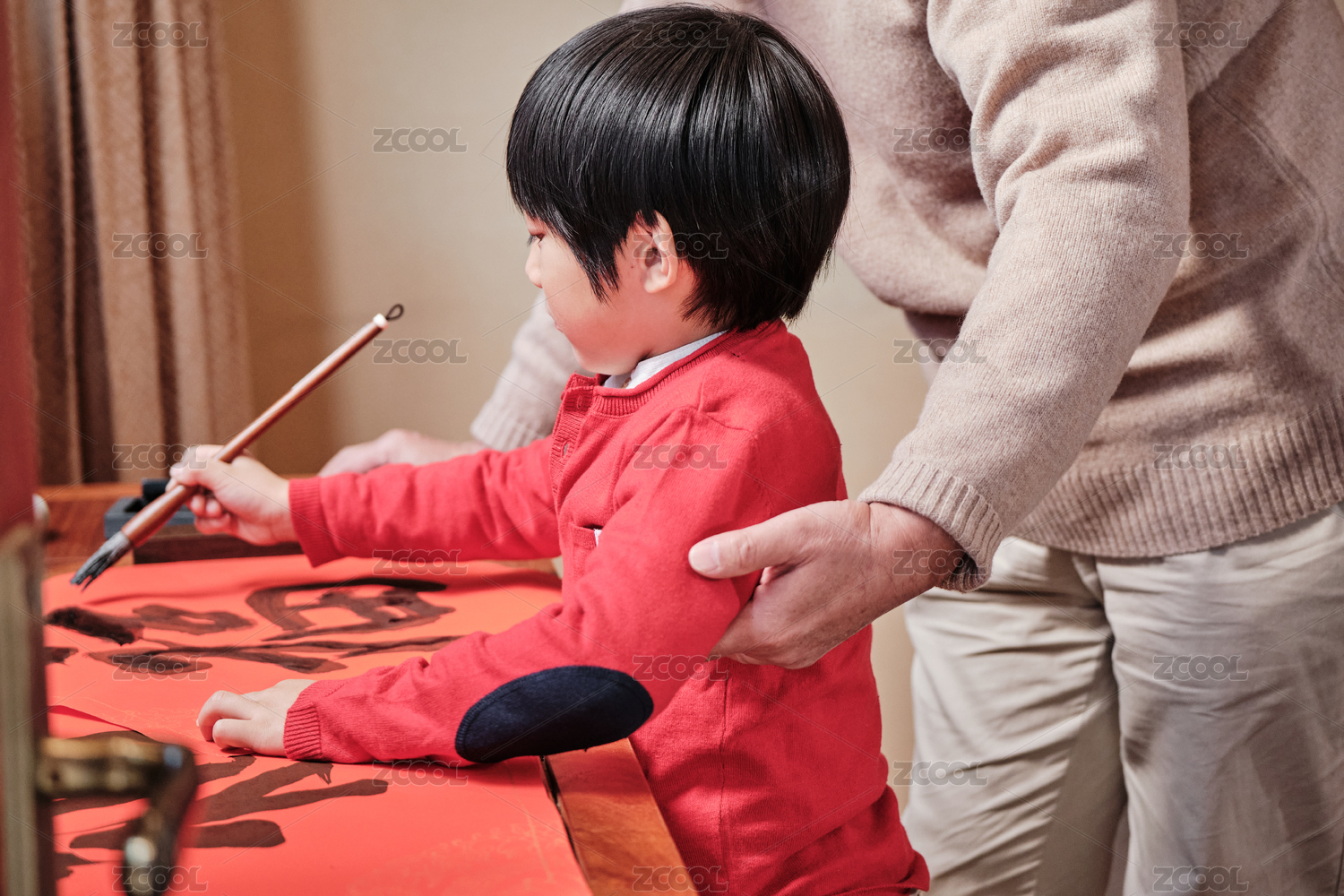 住宅客厅中孙子指导爷爷坐在沙发上学习读书识字插画