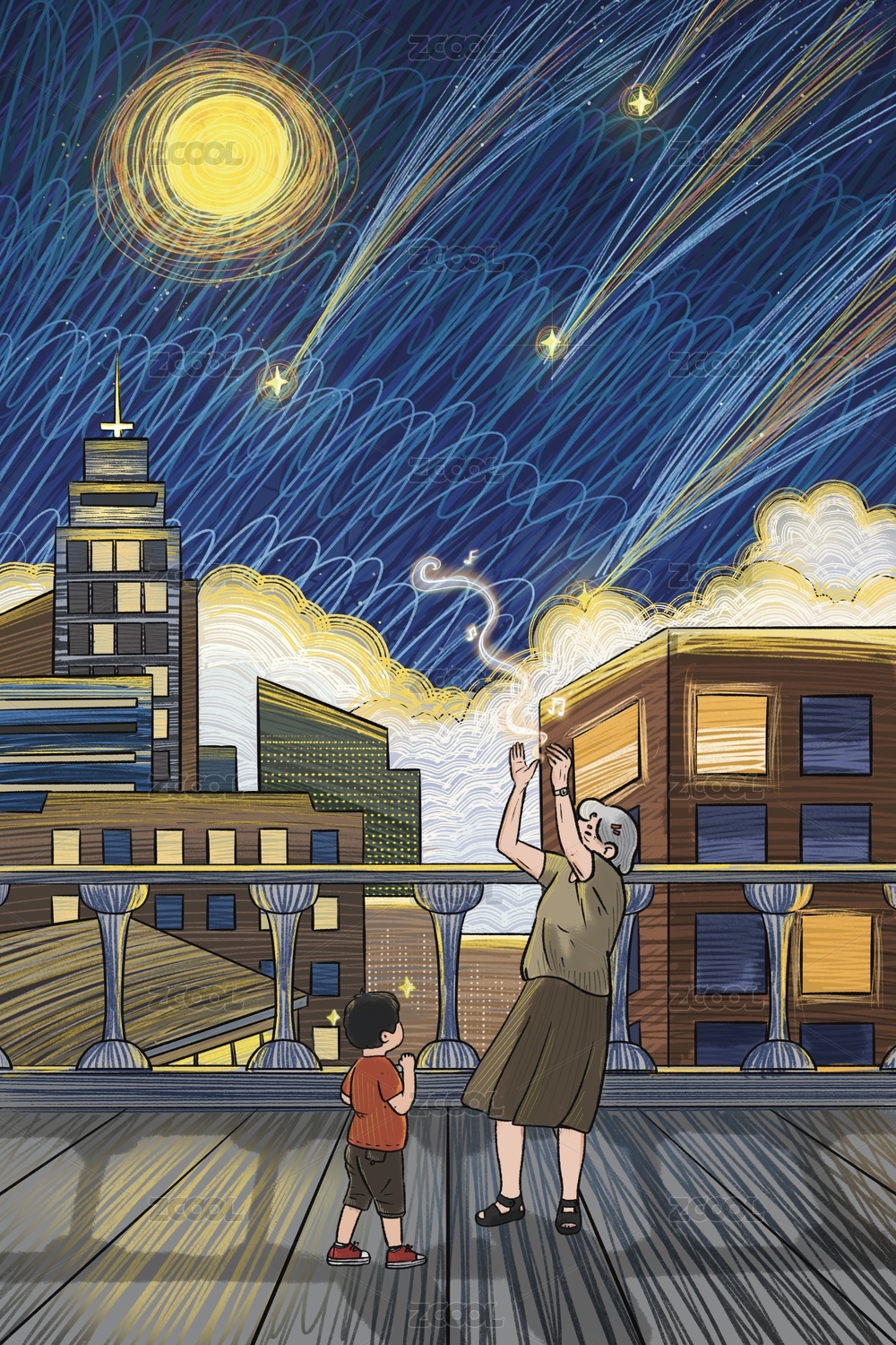 星空夜晚城市天台上奶奶和孙子在放飞梦想