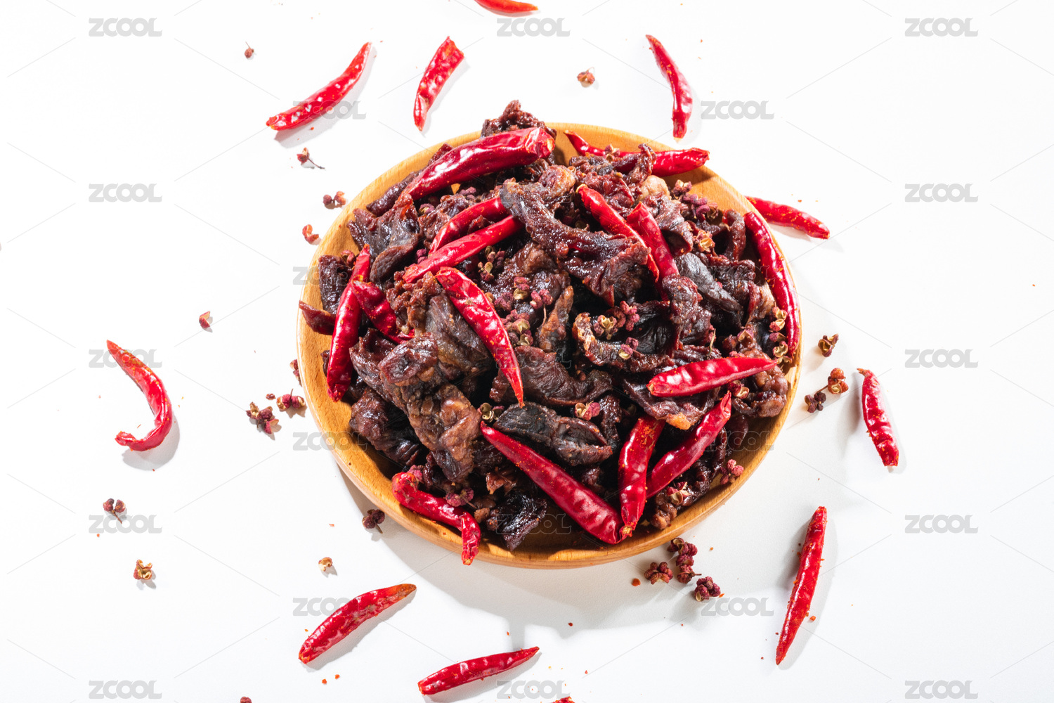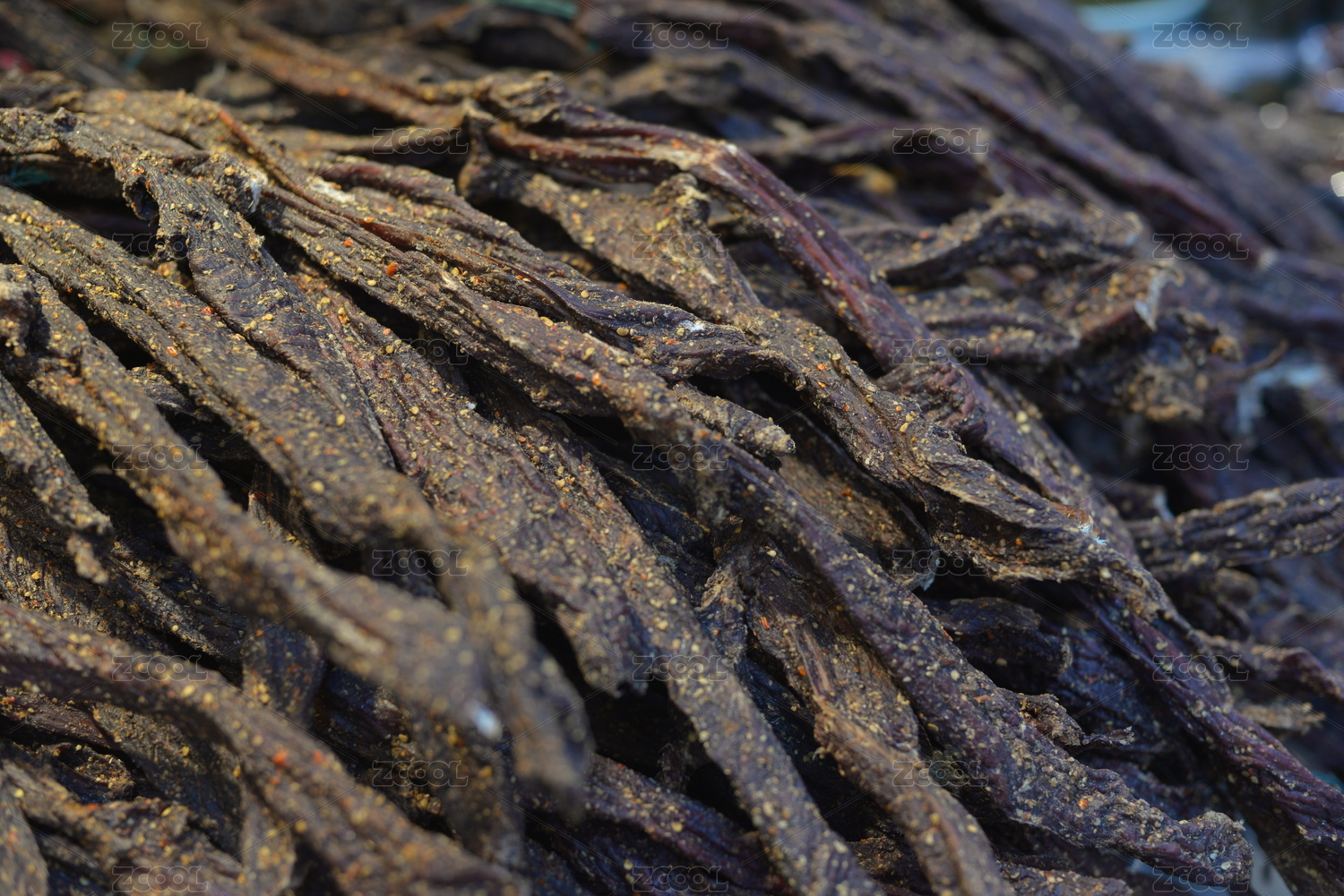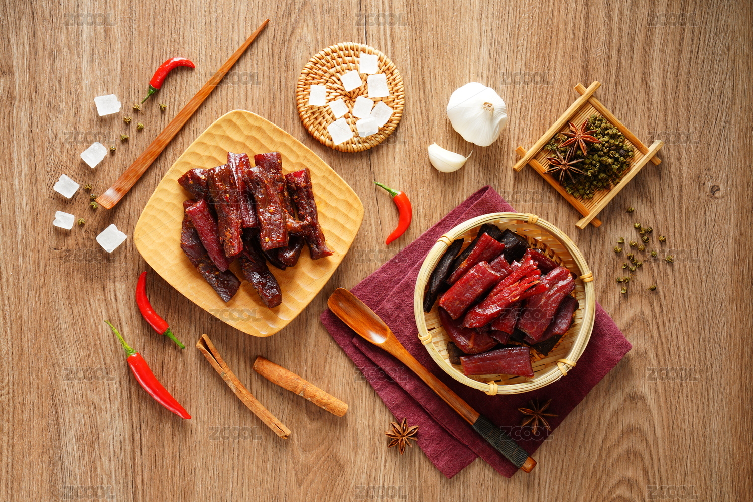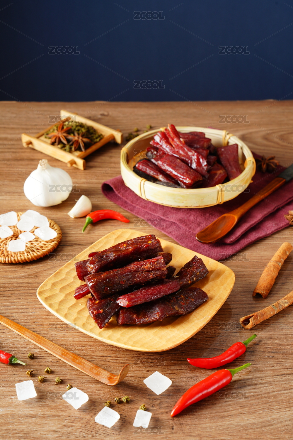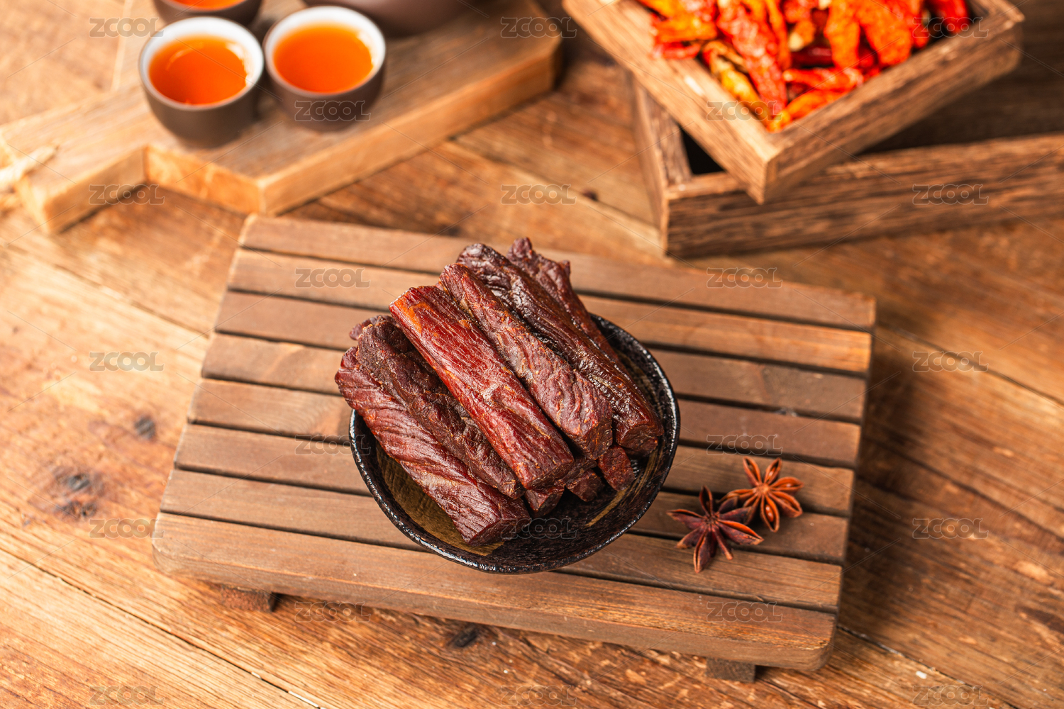 木桌上的香辣风干牛肉干