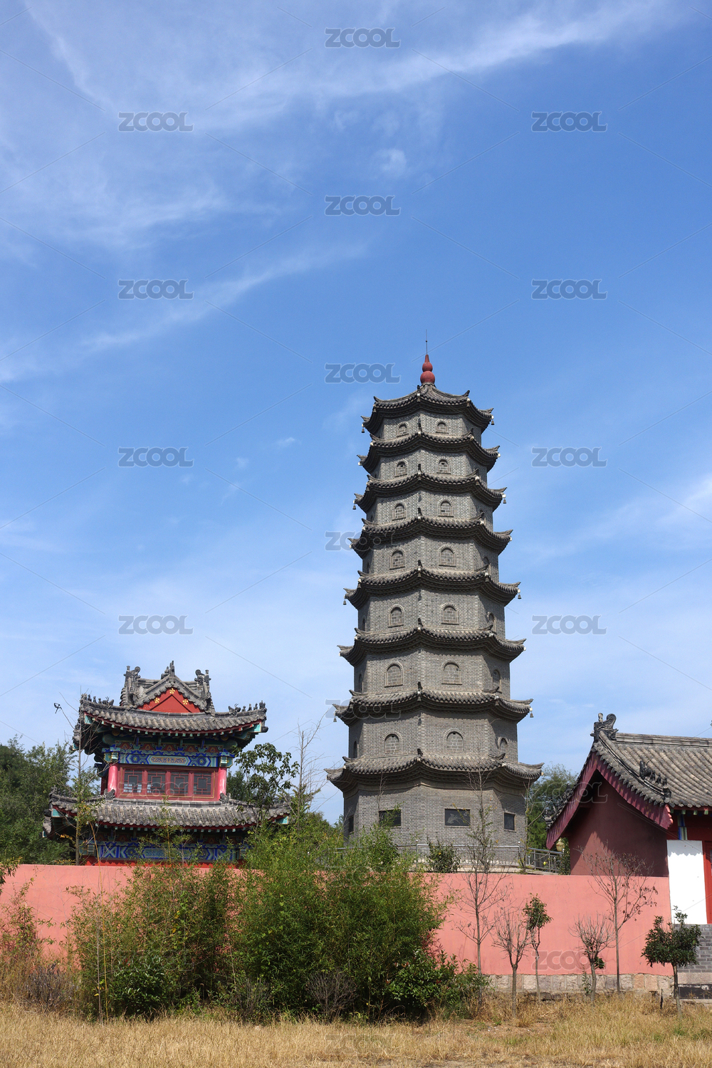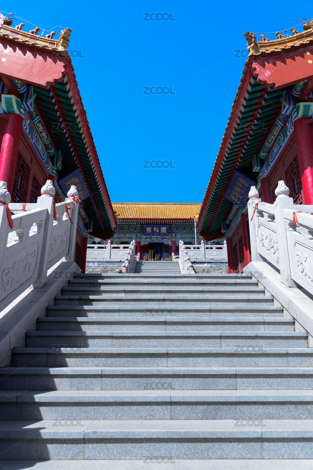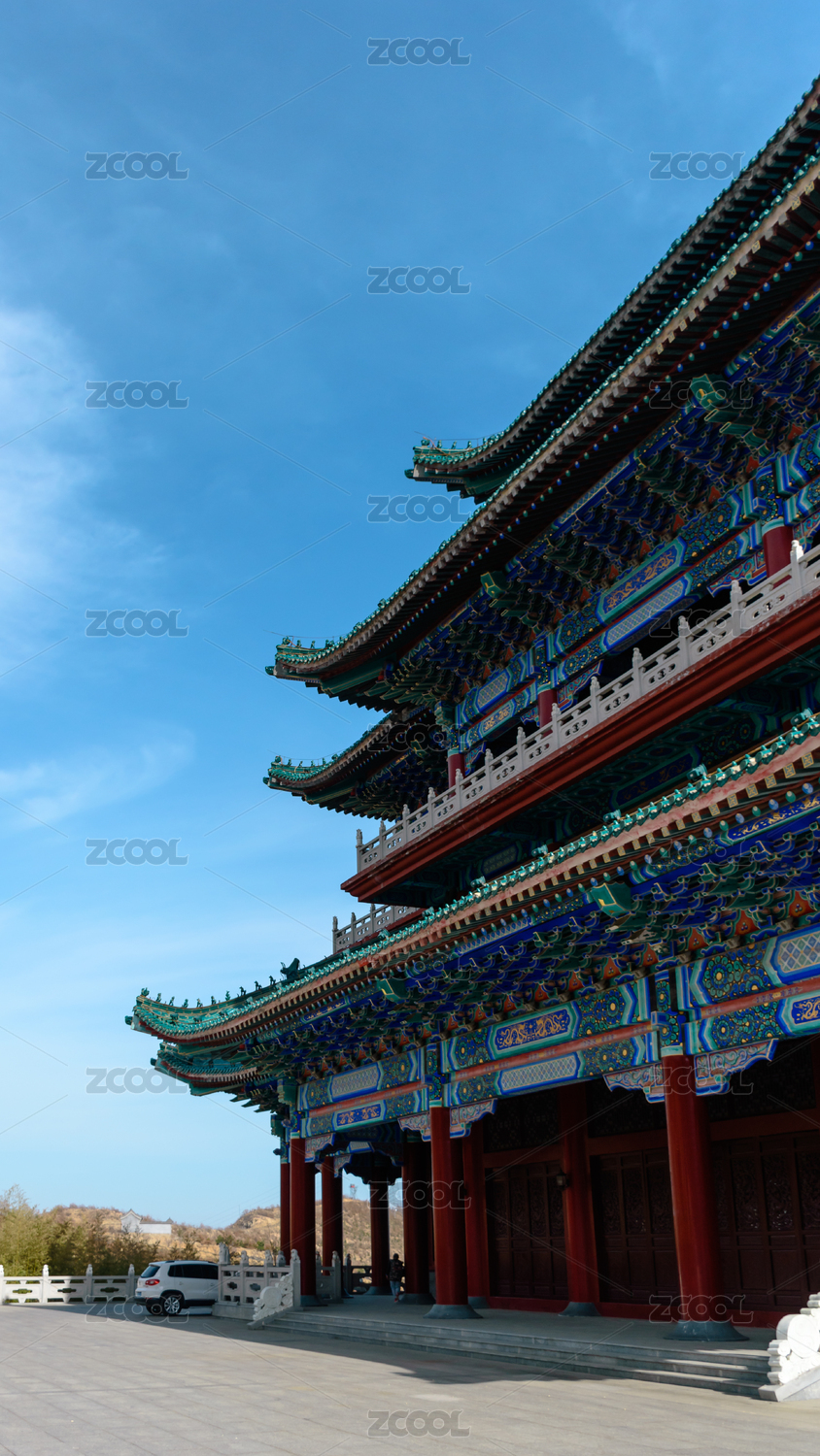中国山东威海仙姑顶景区的红色廊柱