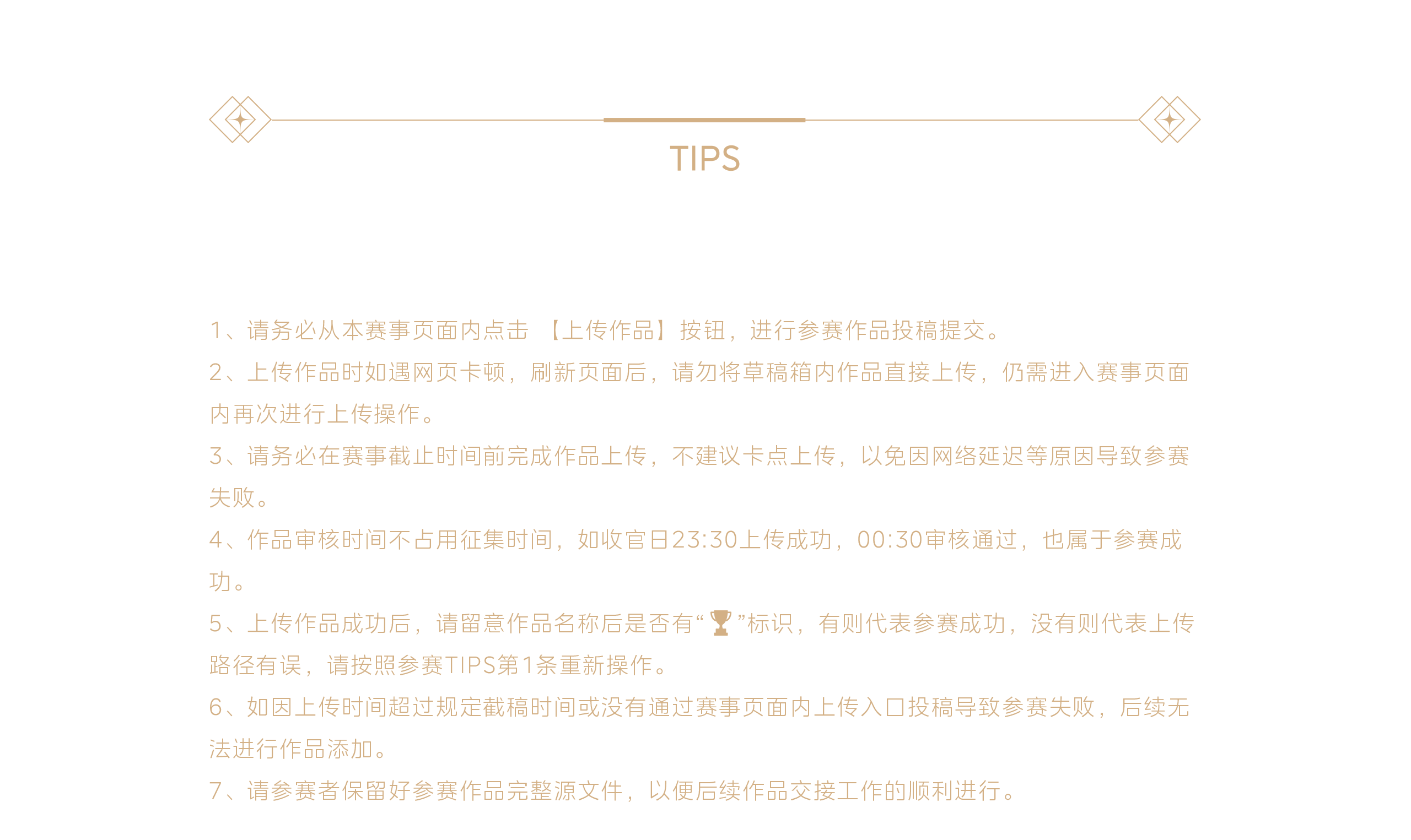 12、因赛事中后期作品上传量较大,请参赛者合理安排参赛时间,及时交稿,避免重复上传或上传失败。