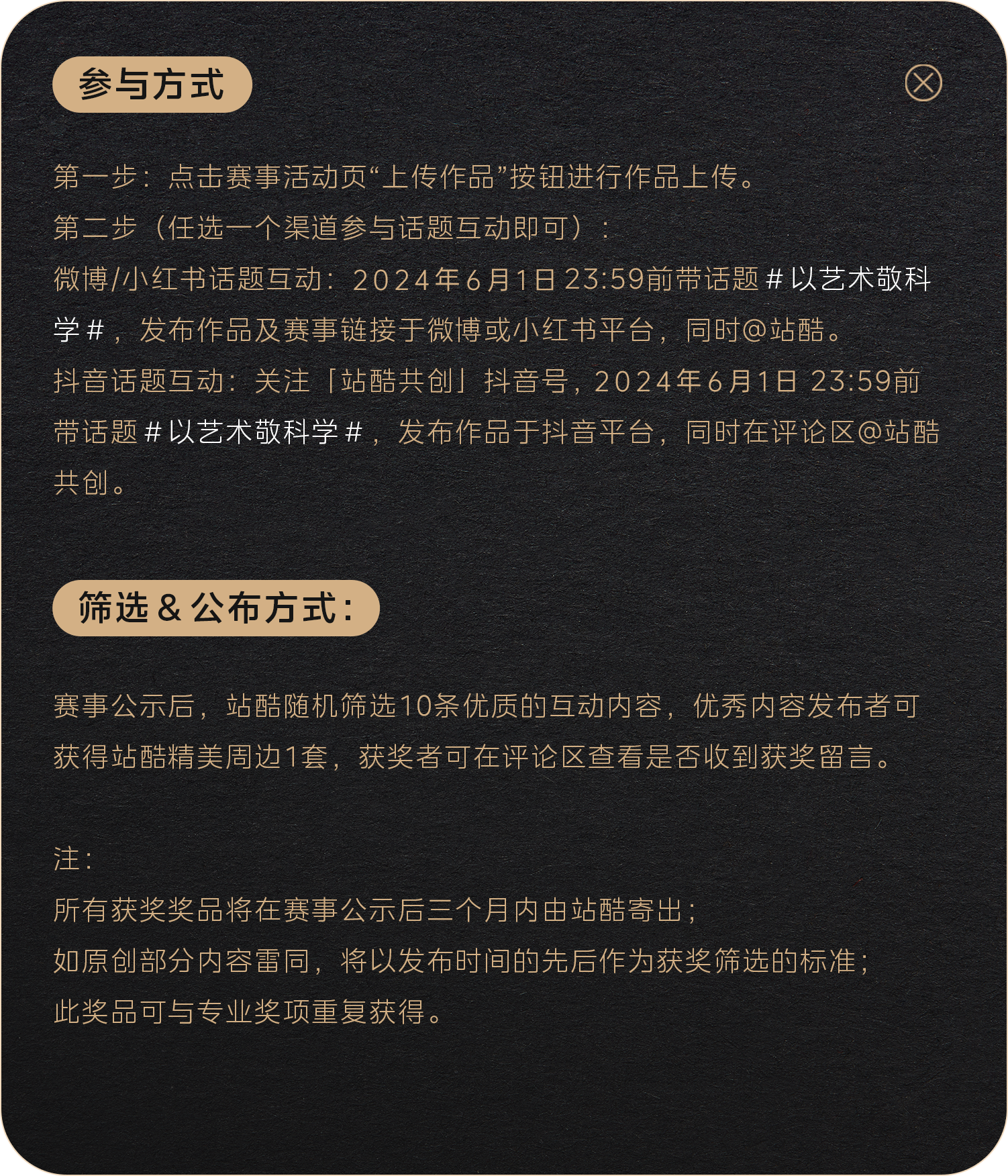 2、获奖者在活动结束后请注意查收邮件,并根据邮件提示内容及时配合主办方完成作品收集、相应版权协议签署及奖金奖品发放等工作。