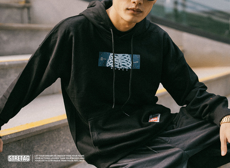 STRETAG原创潮流宽松胸口碎大石黑色连帽纯棉卫衣