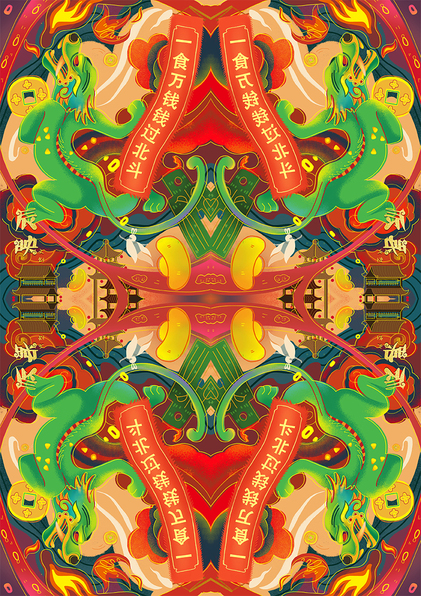 年兽、貔貅神兽插画新年海报