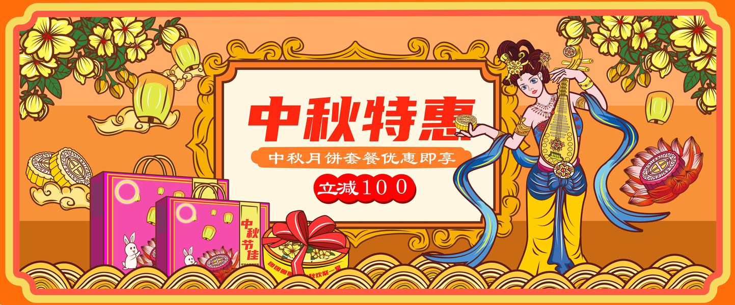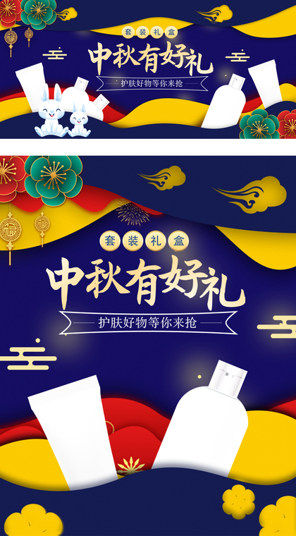 插画中秋节中秋有好礼美妆美容护肤品电商海报banner