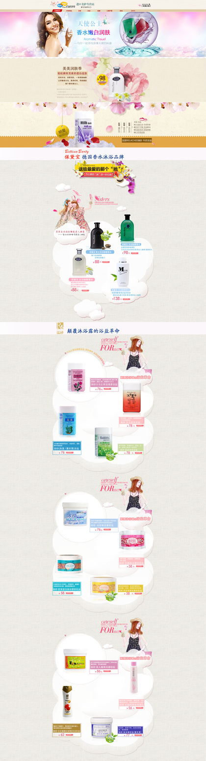 春意春色五一51页面装修树叶绿色木纹优惠券 花草蝴蝶印章 商城首页 化妆品 机理设计