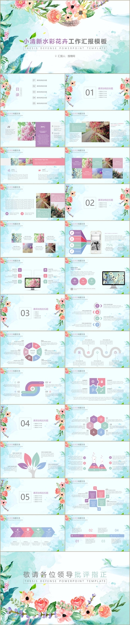 小清新水彩花卉风月季度工作总结汇报PPT模板