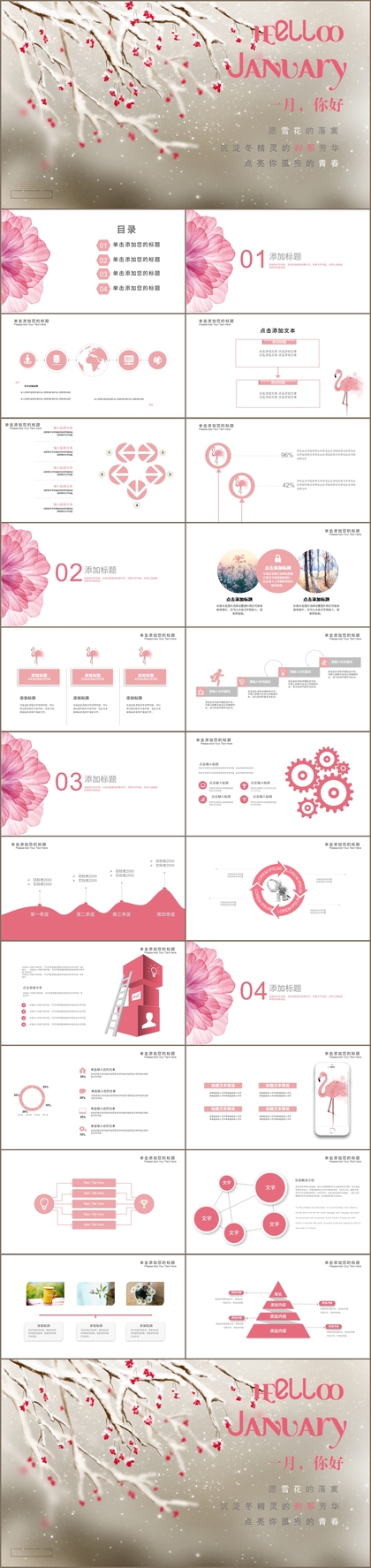 冬日唯美缤纷雪花一月你好文艺清新设计通用PPT模板