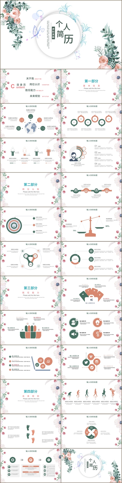 简约清新手绘花卉文艺风个人简历岗位竞聘PPT模板