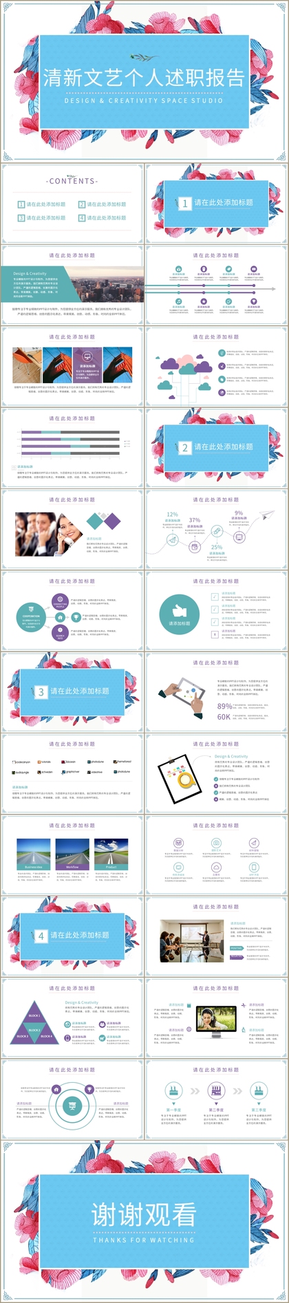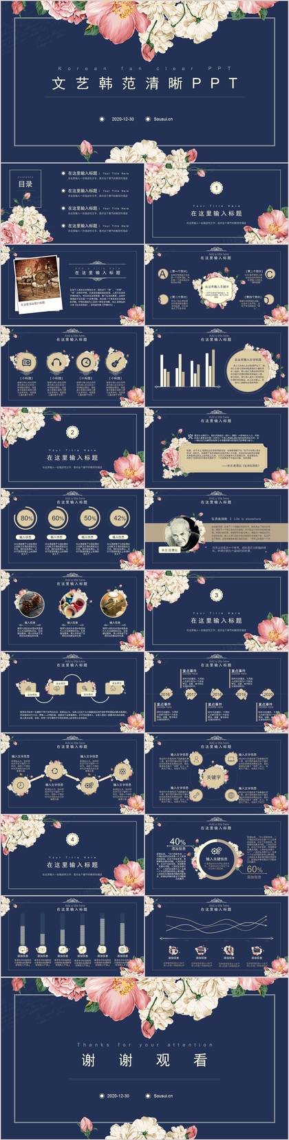 唯美花卉蓝色韩范清新文艺商务企业办公通用PPT模板