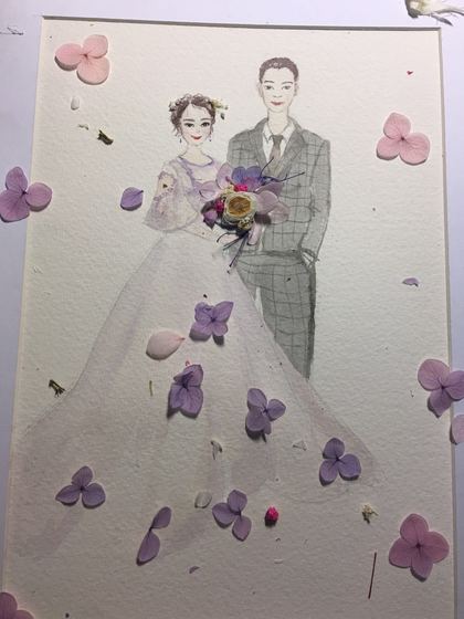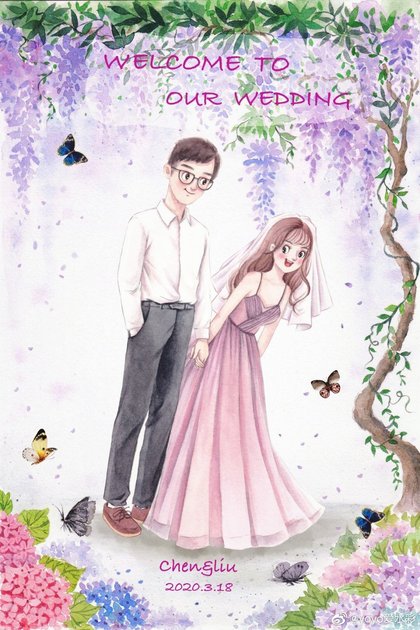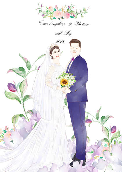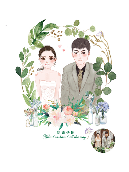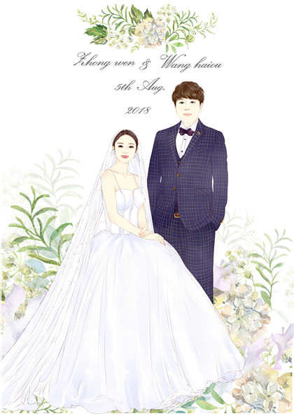 手绘水彩婚纱请柬新人肖像奥运五金王邹凯周捷婚礼画师