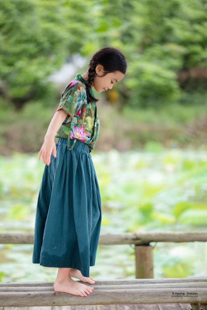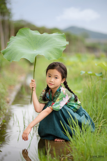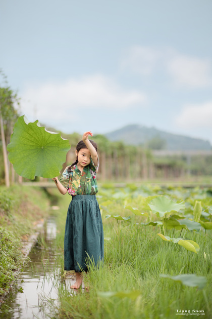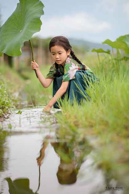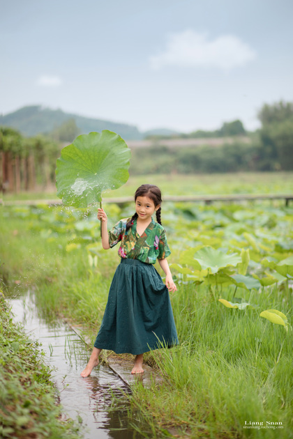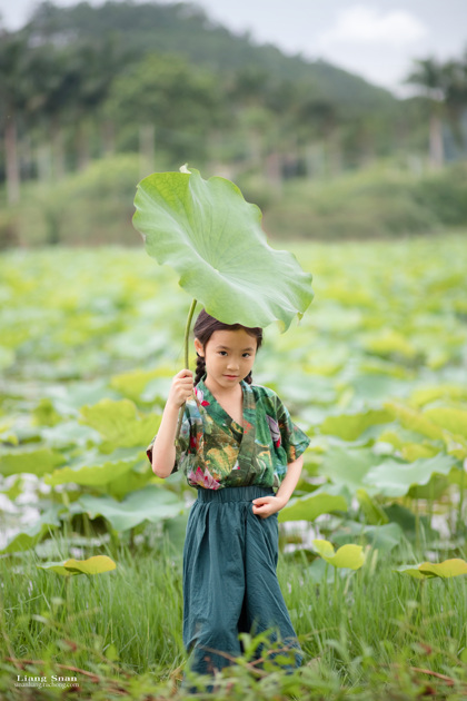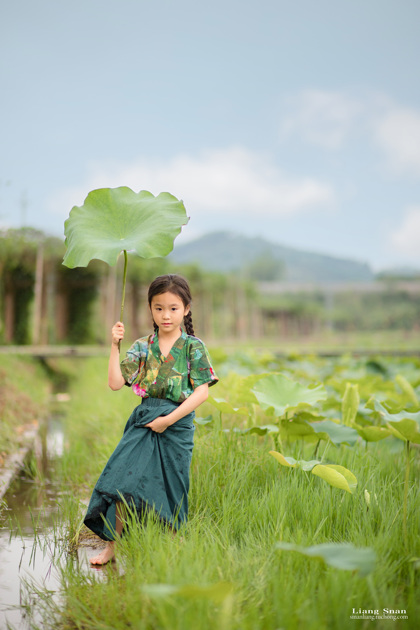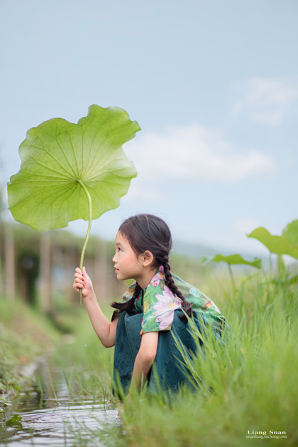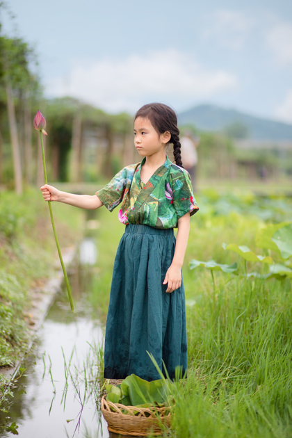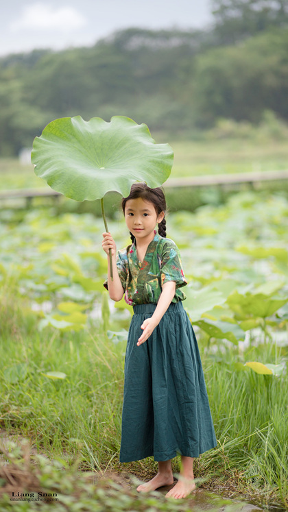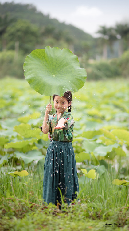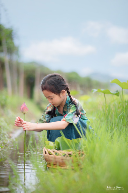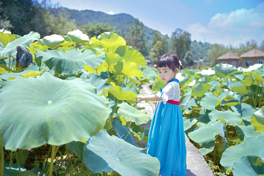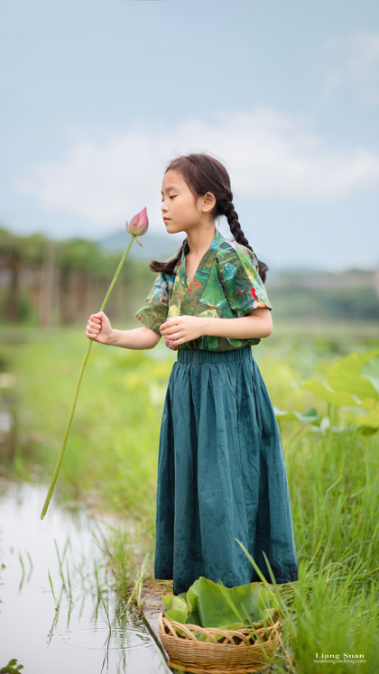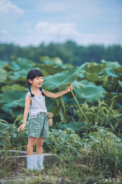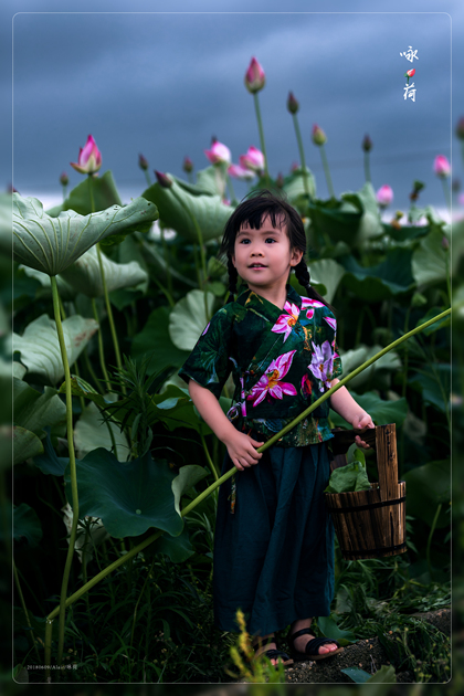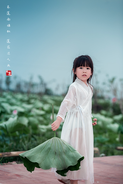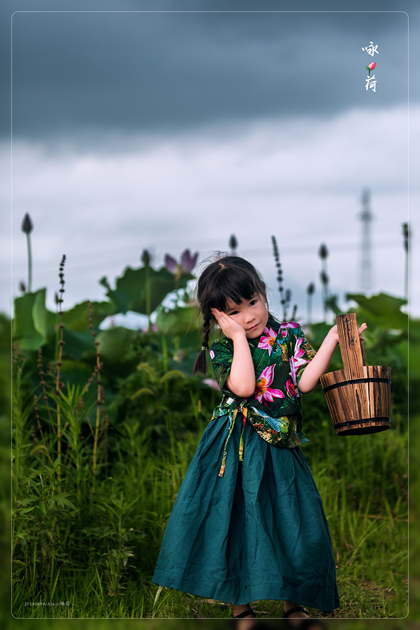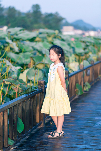 清晨的荷塘边女孩