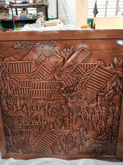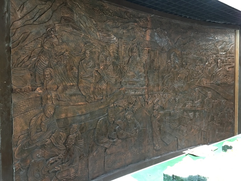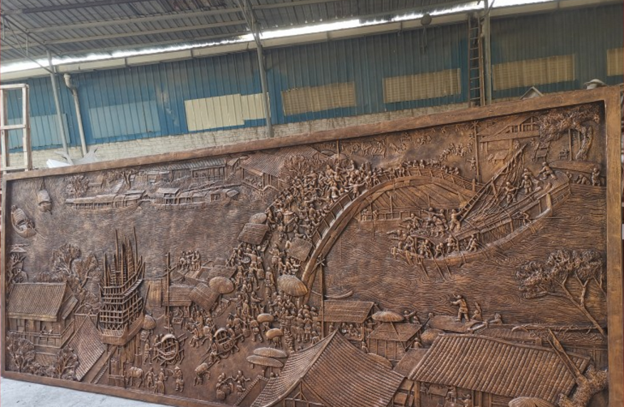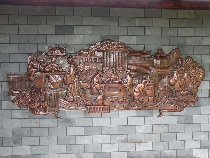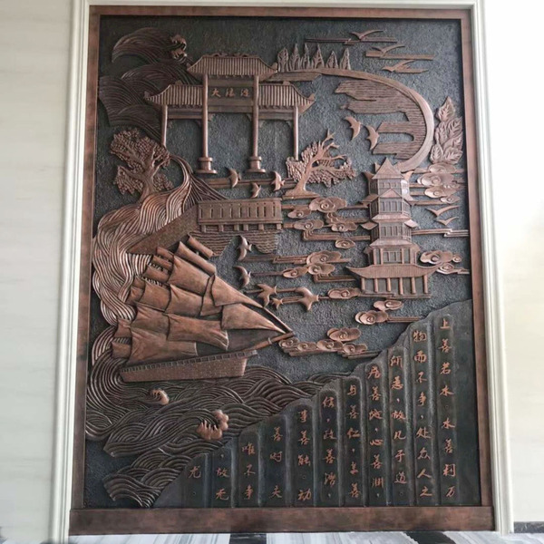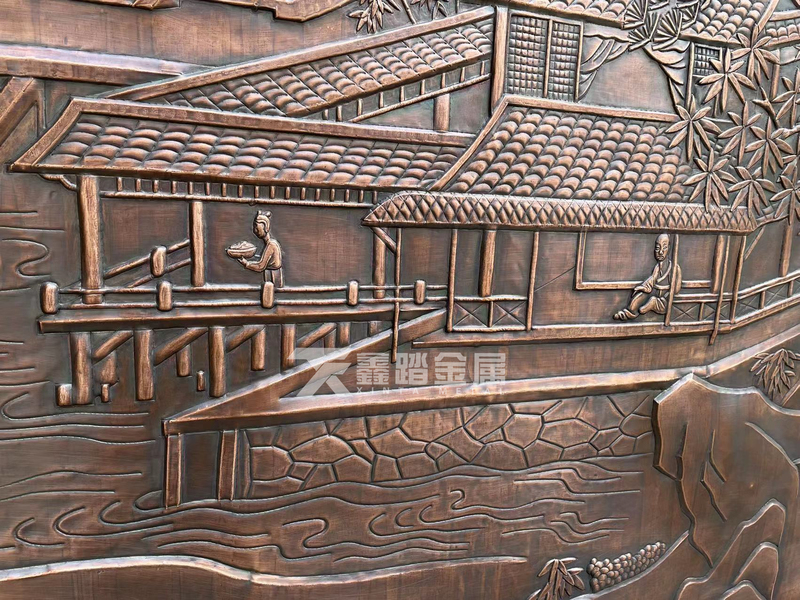 中式景墙紫铜锻造壁画 手工锻铜浮雕山水历史文案壁画